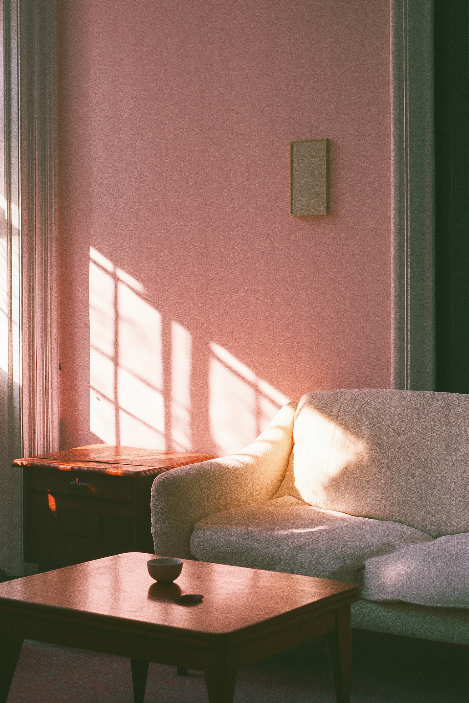 Minimalist living room with a white sofa, wooden furniture, and warm sunlight casting shadows on a pastel pink wall.