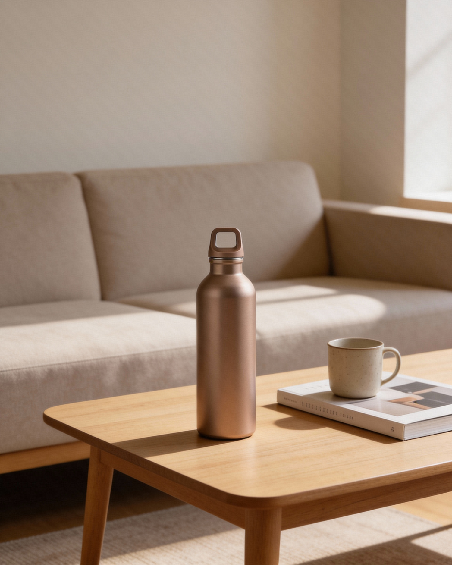 A cozy living room with a wooden table, a metallic water bottle, a ceramic mug, and a book, bathed in soft natural light.