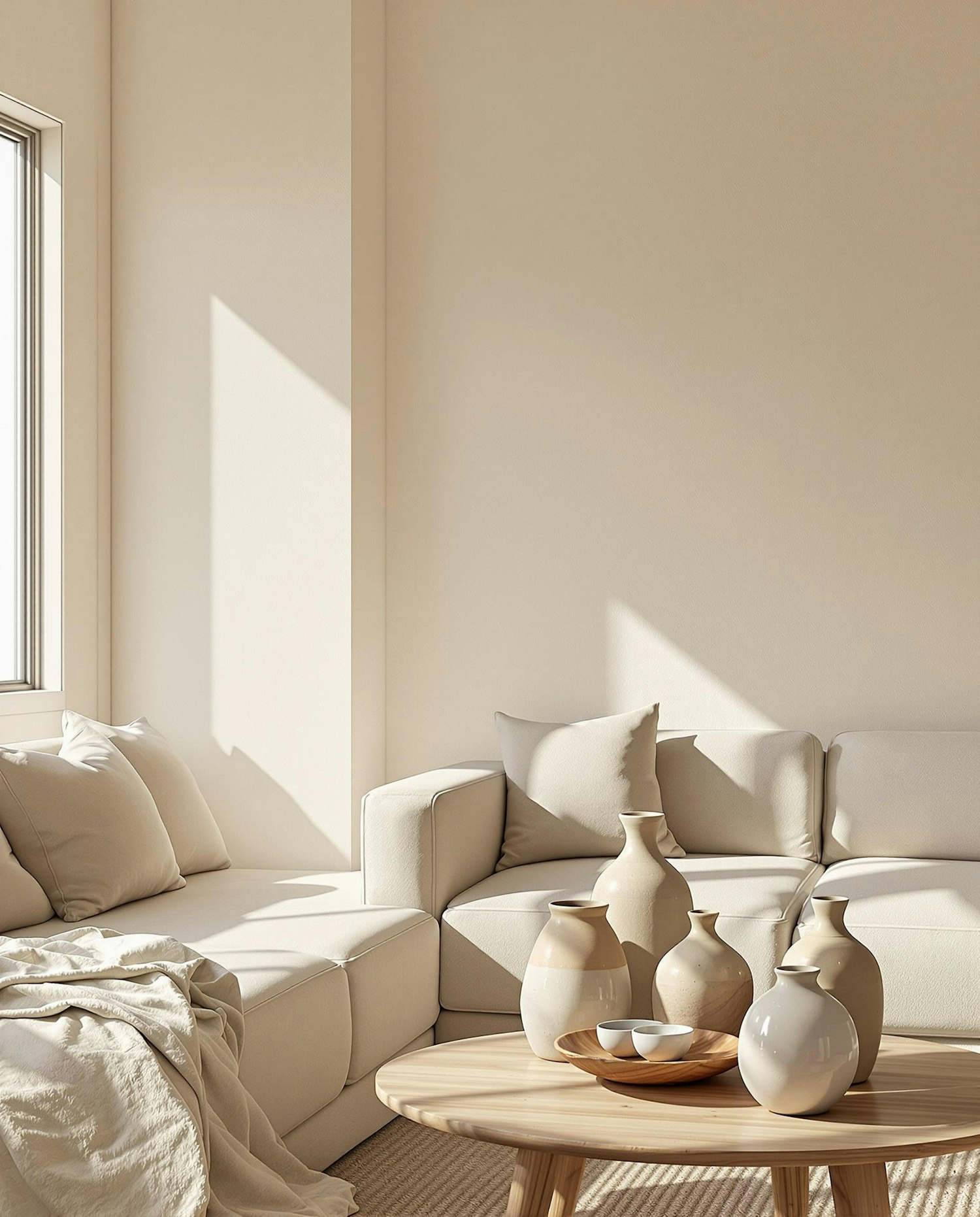 Minimalist living room with a cream sectional sofa, wooden coffee table, and neutral ceramic vases, bathed in warm natural sunlight.