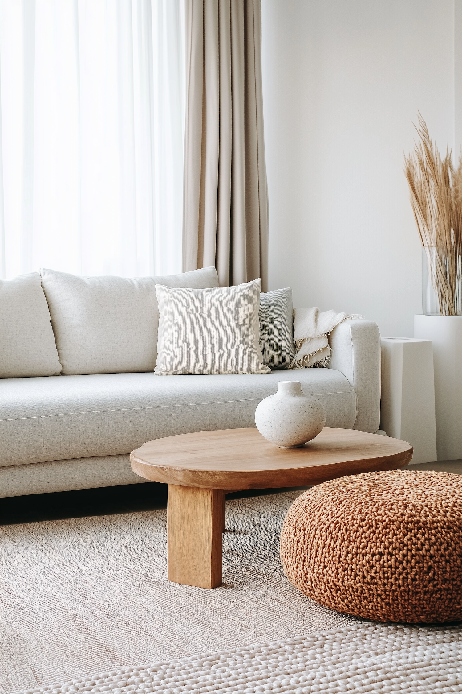 Minimalist living room with beige sofa, wooden coffee table, woven pouf, pampas grass, and neutral tones for a cozy, natural vibe.