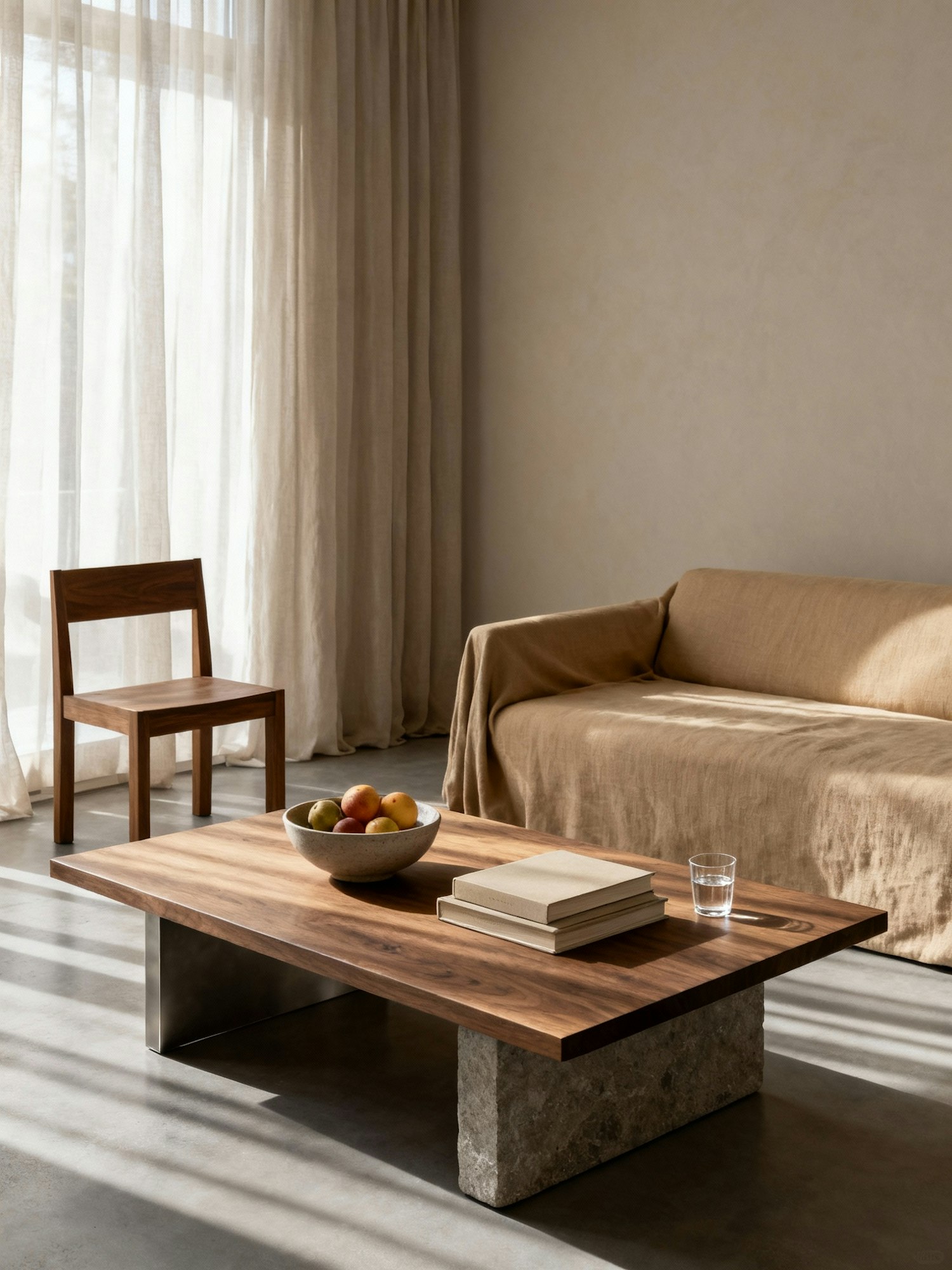 Minimalist living room with a wooden coffee table, beige sofa, and natural light through sheer curtains, creating a serene ambiance.