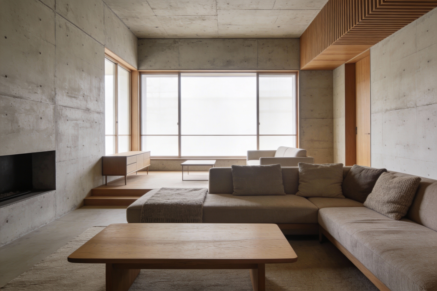 Japanese-Scandinavian (Japandi) architecture and interior design, strong Japanese restraint with Scandinavian warmth, minimalist residential space, natural oak wood, raw concrete and plaster surfaces, low-profile forms, clean horizontal lines, soft neutral palette, daylight-driven composition, calm and quiet atmosphere, emphasis on proportion, material honesty, and negative space, editorial architectural photography, ultra-realistic, high detail, no people, no clutter, no text Japandi living room, low seating, linen or wool textiles, minimal furniture, large windows, soft natural daylight, balanced and airy composition