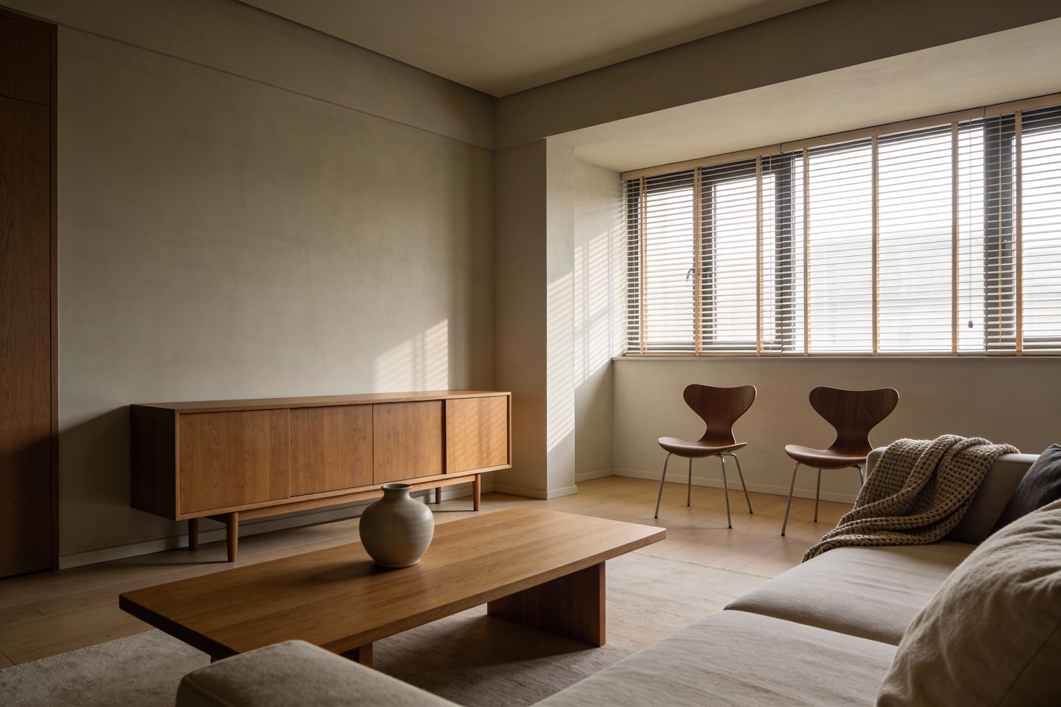 Minimalist living room with wooden furniture, beige sofa, and natural light streaming through blinds, creating a cozy and elegant atmosphere.