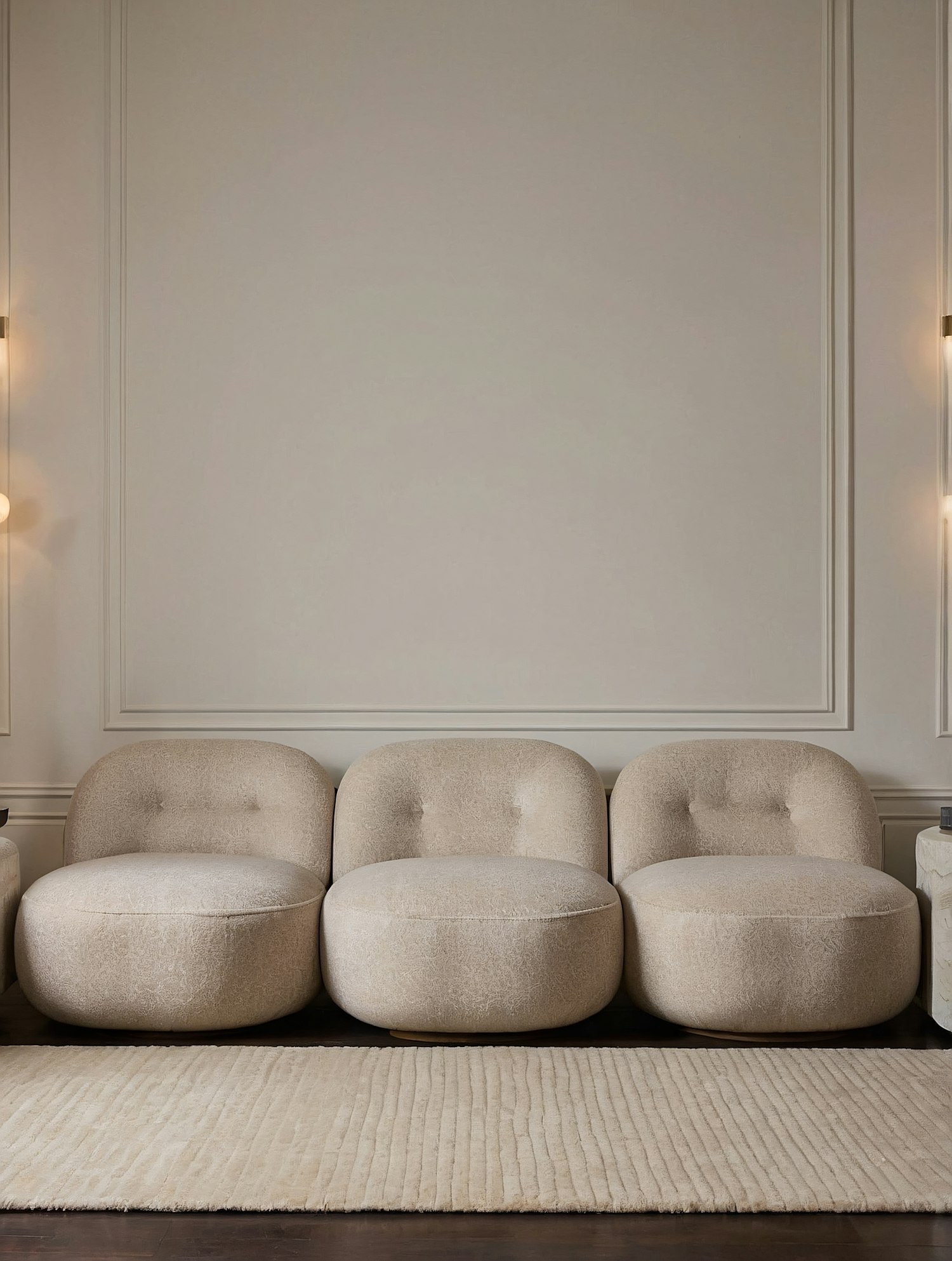 Minimalist living room with beige rounded armchairs, panelled walls, warm sconces, and a ribbed area rug on dark wooden flooring.