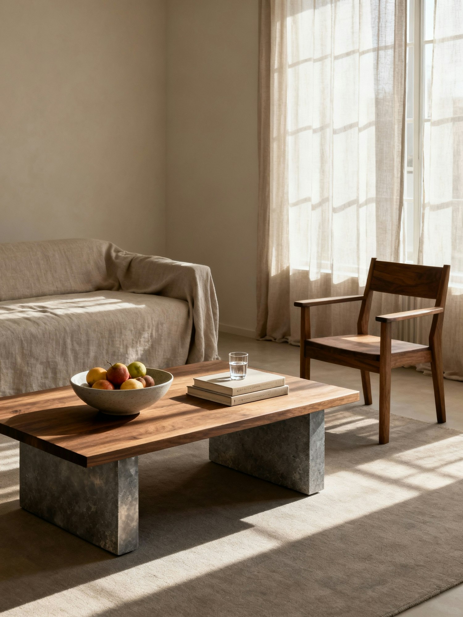 Nordic interior photography, shot in natural daylight — serene and contemplative atmosphere. Soft diffused light from side windows, gentle shadows, warm neutral palette with tones of beige, tan, and muted brown. Use raw and tactile materials like oak wood, linen, stone, brushed metal. Minimal composition with air and negative space. Realistic photo with subtle grain, no overexposure. Architectural framing, calm and timeless design aesthetic inspired by FRAMA — quiet luxury, Scandinavian minimalism, sensory stillness. A spacious living room with a low oak coffee table surrounded by a linen-covered sofa and a wooden armchair. On the table, a ceramic bowl with fruit, a stack of neutral books, and a small glass of water. The room is softly illuminated by daylight coming through large sheer curtains. The palette is cohesive — warm beige, wood brown, soft grey — evoking timeless Nordic elegance and tranquility.