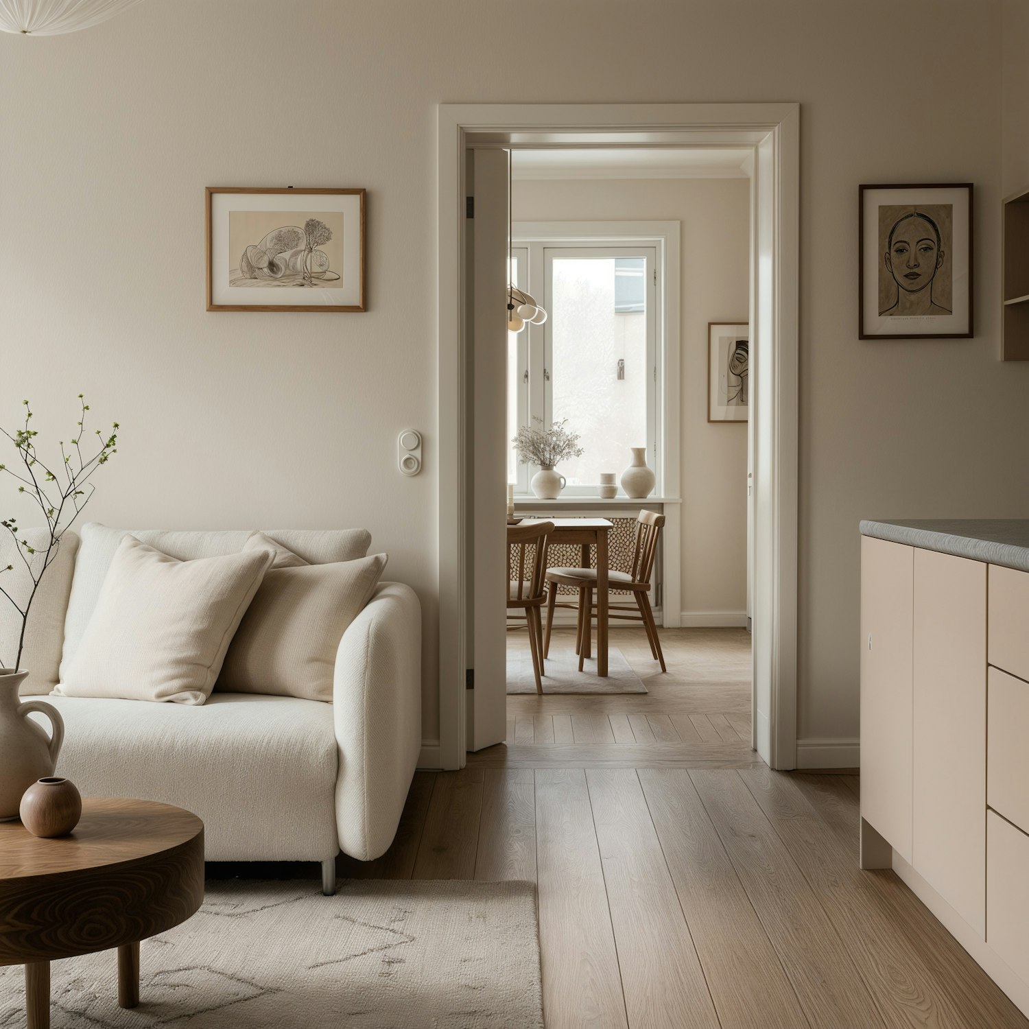 Minimalist living room with a white sofa, wooden coffee table, and a dining area in the background, all in a soft beige color palette.