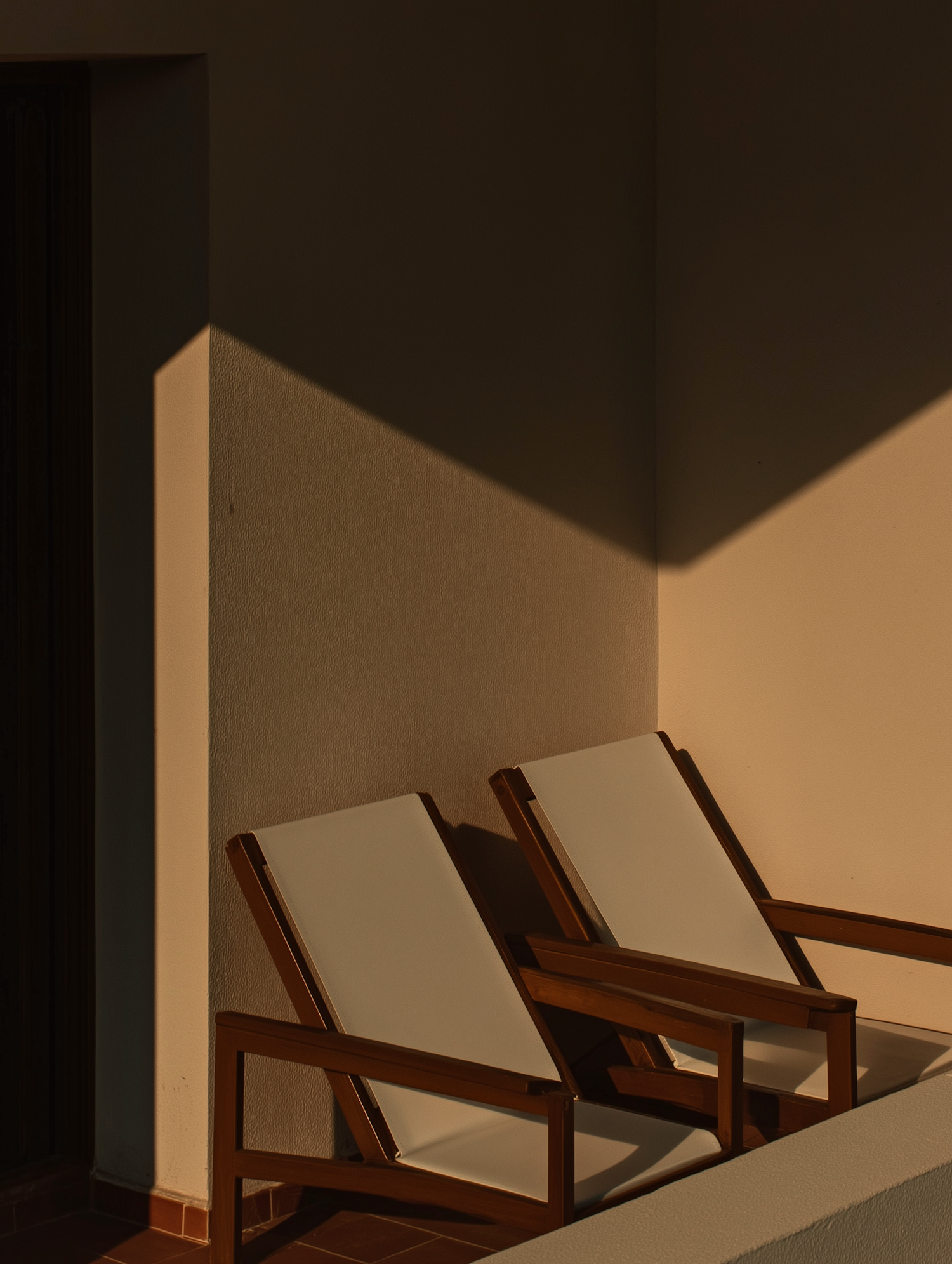 Minimalist composition highlighting light and shadow play with two white lounge chairs against a beige wall creating a relaxing atmosphere.
