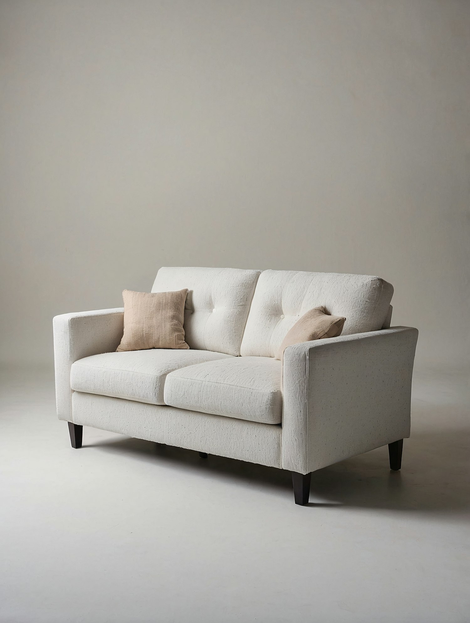 Minimalist off-white loveseat with tufted cushions, beige throw pillows, and dark wooden legs. Perfect for modern, cozy interiors.