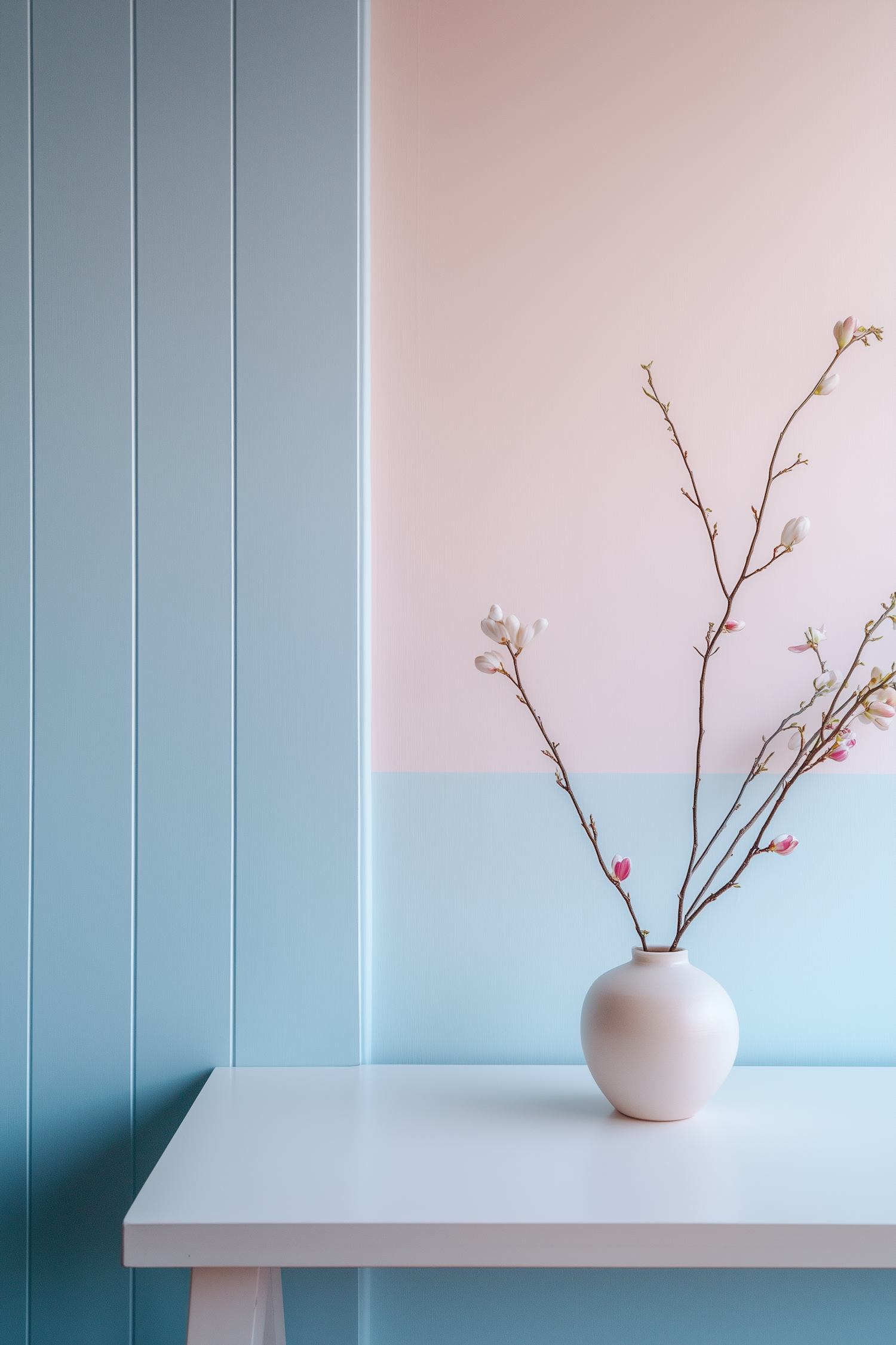Minimalist decor with a white vase of magnolia branches on a white table, set against a pastel pink and blue two-toned wall.
