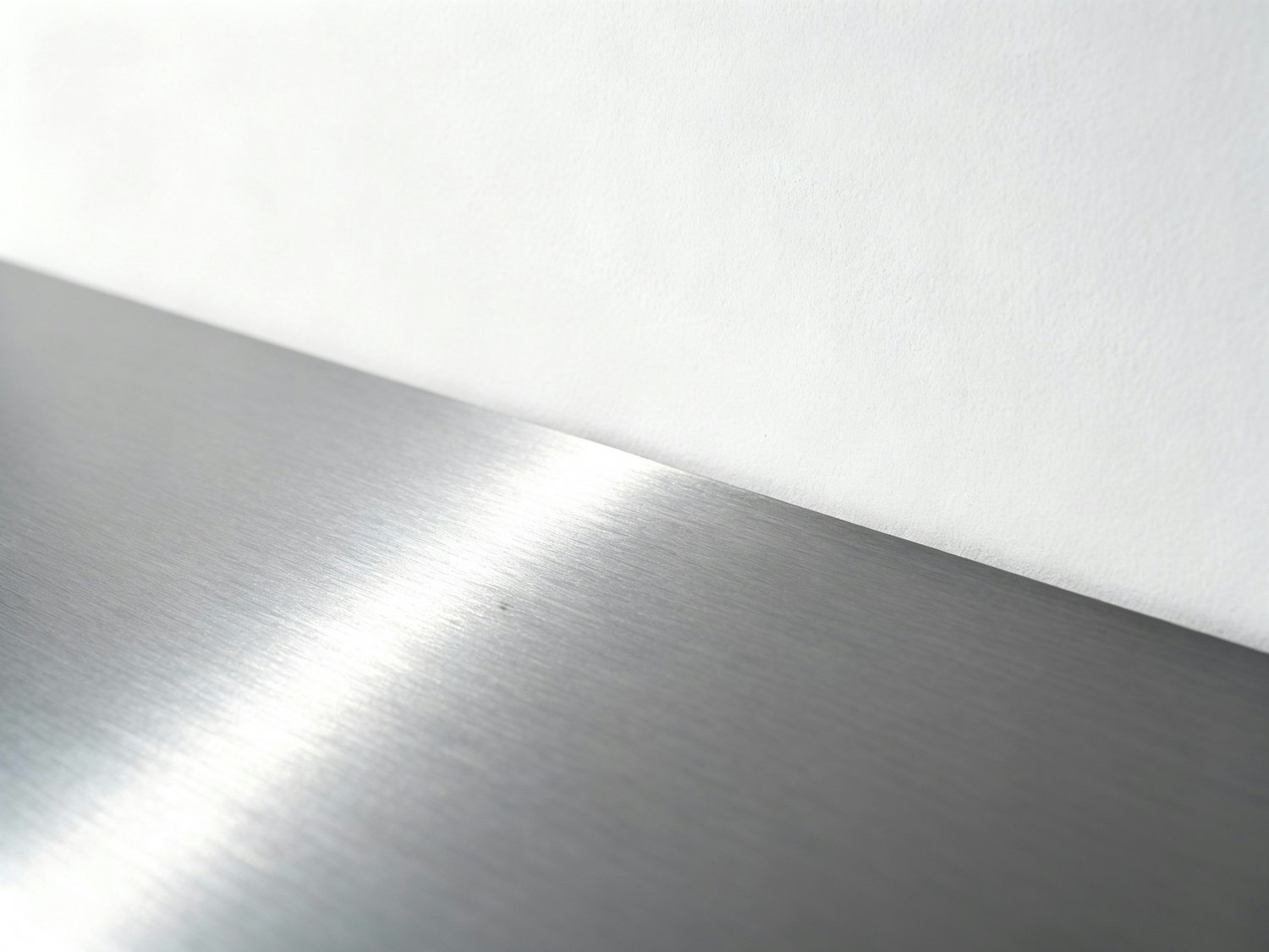 Minimalist composition of a brushed metal surface meeting a smooth white wall, showcasing textures and light interplay.