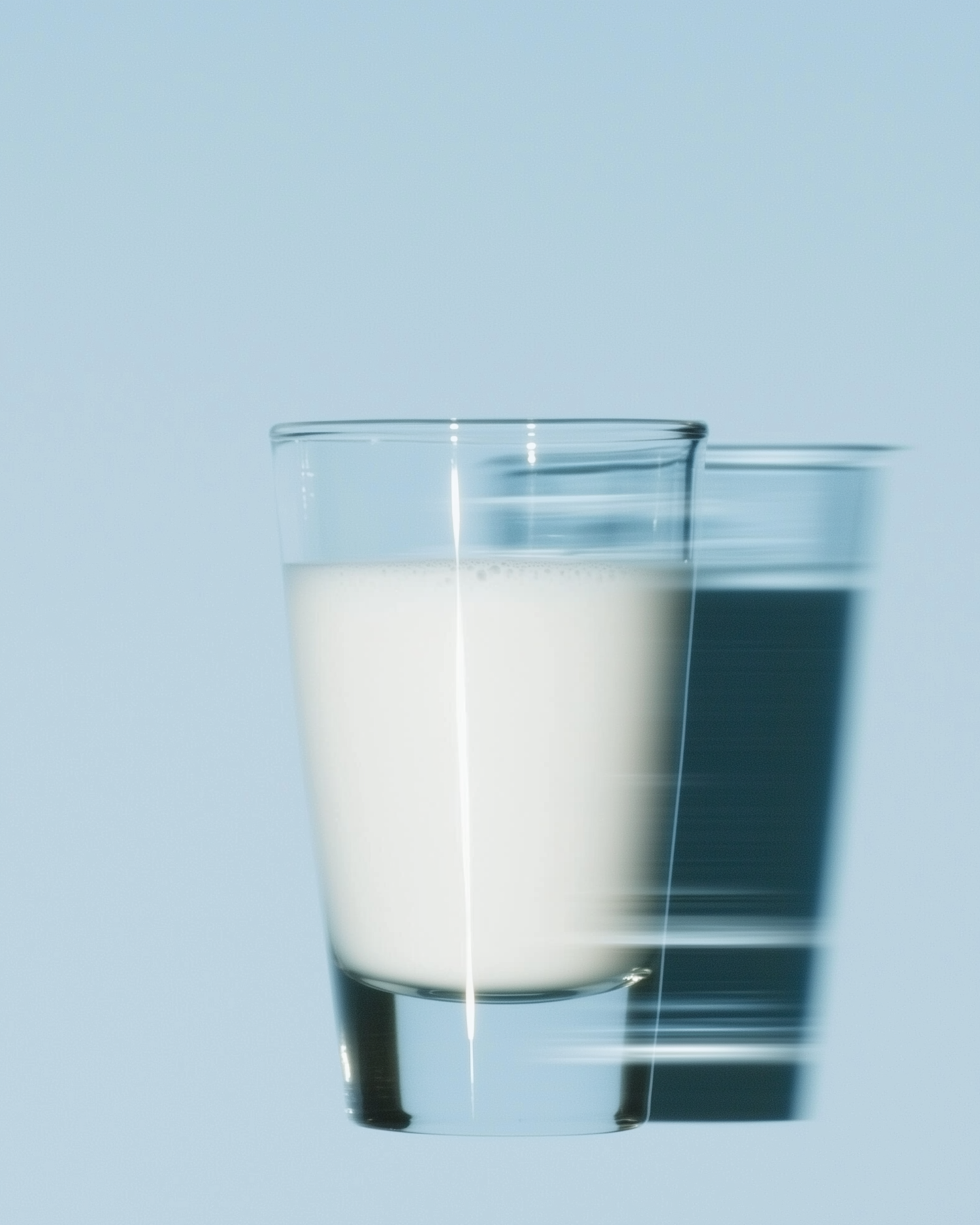 A clear glass of milk with motion blur effect on a light blue background, creating a minimalist and dynamic visual aesthetic.