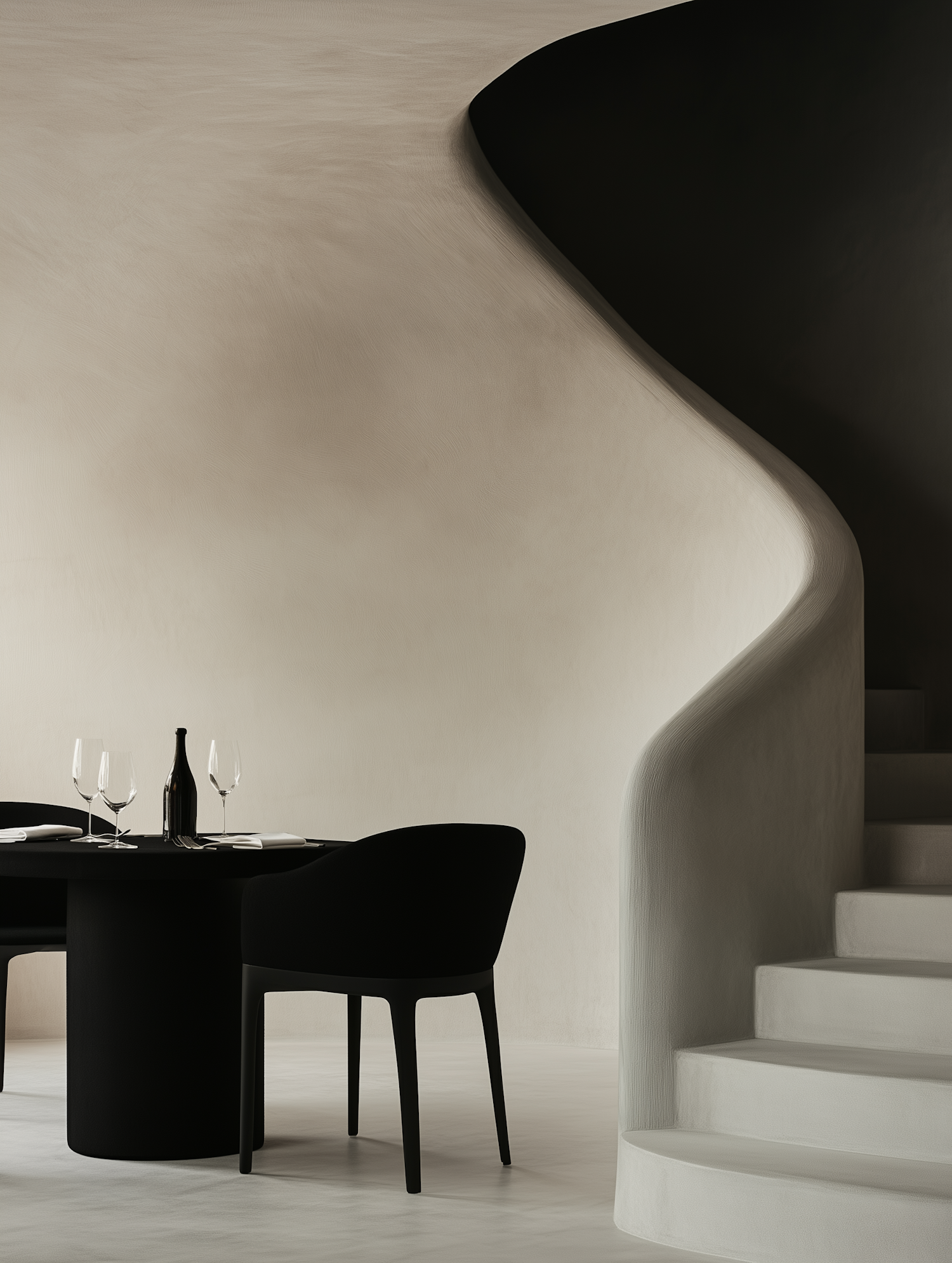 Minimalist dining area with black furniture, wine glasses, and a curved staircase in a neutral-toned modern interior.