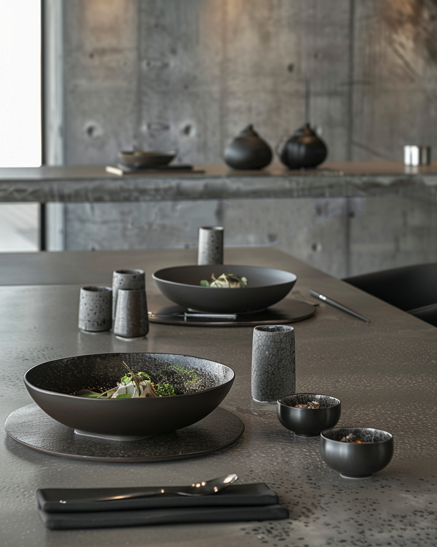 Minimalist dining setup with dark matte tableware on a sleek table, set against a concrete wall for an industrial look.