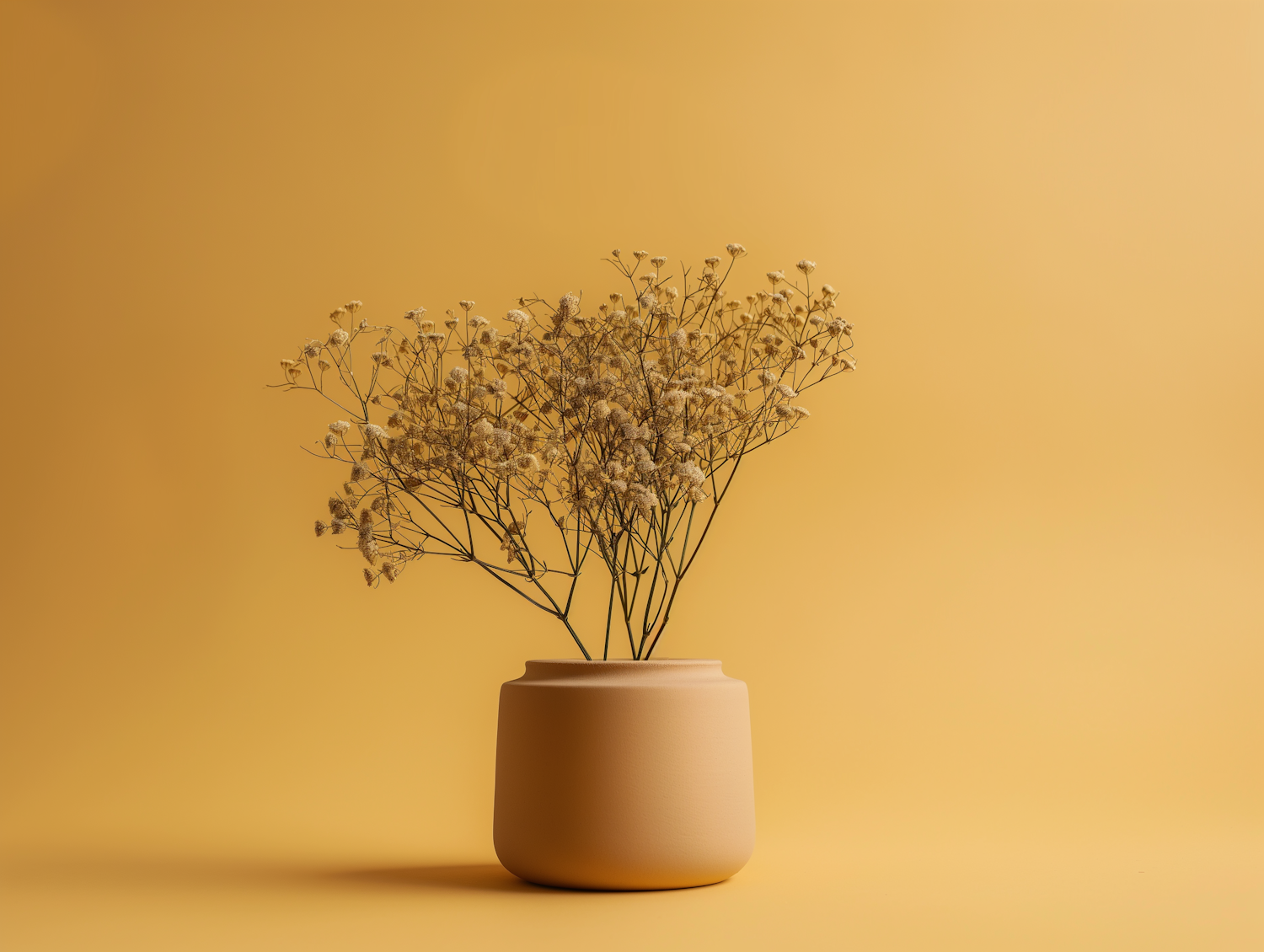Minimalist beige vase with dried baby's breath against a mustard yellow background, creating a warm, monochromatic aesthetic.