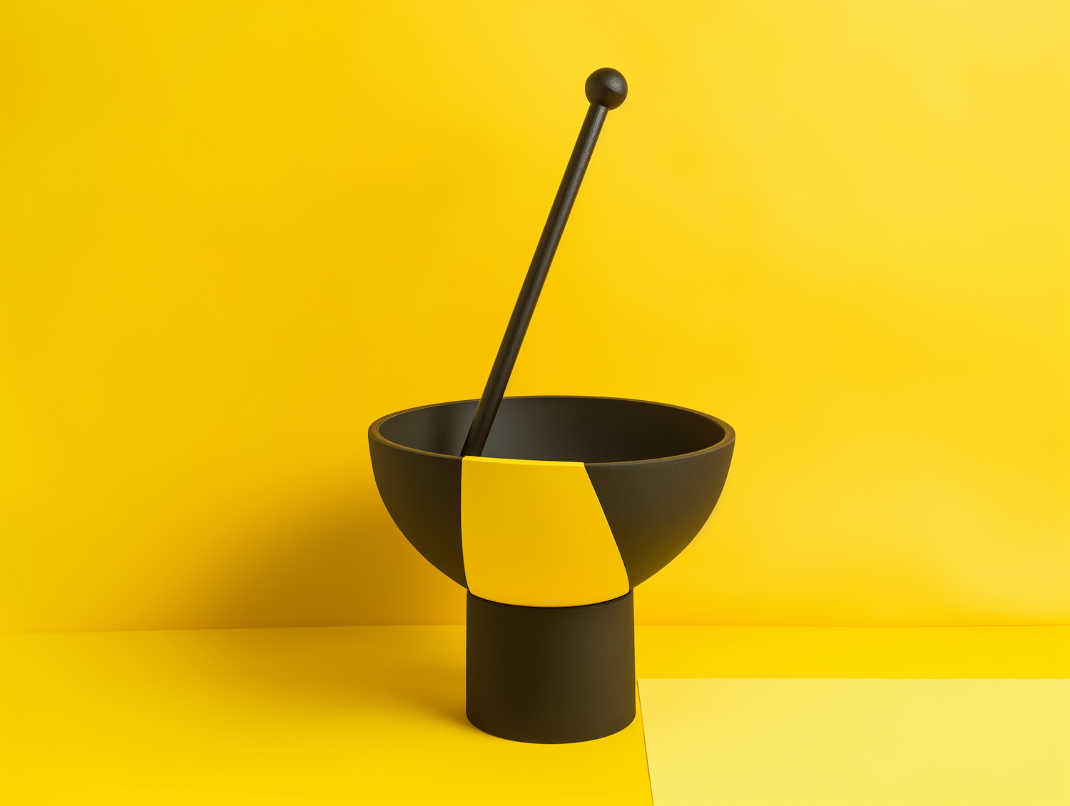 Modern black and yellow mortar and pestle against a vibrant yellow background, showcasing minimalist design and bold contrast.