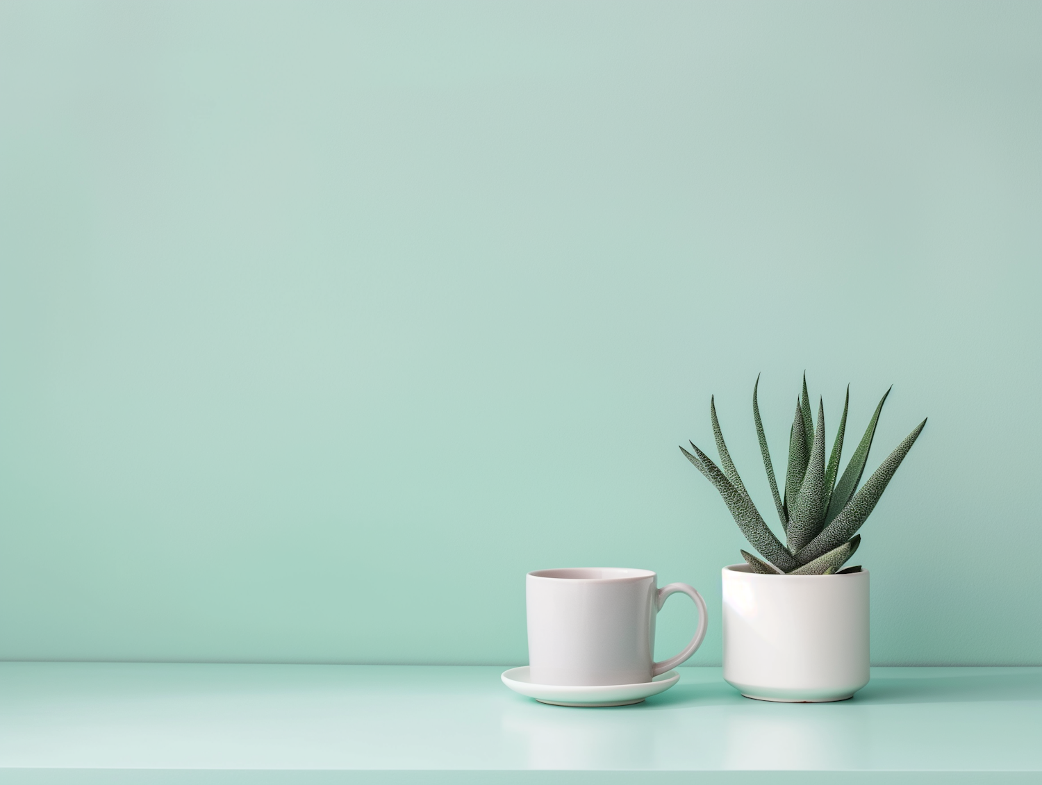 Minimalist mint green scene with a white cup and succulent plant in a white pot, creating a serene and modern aesthetic.