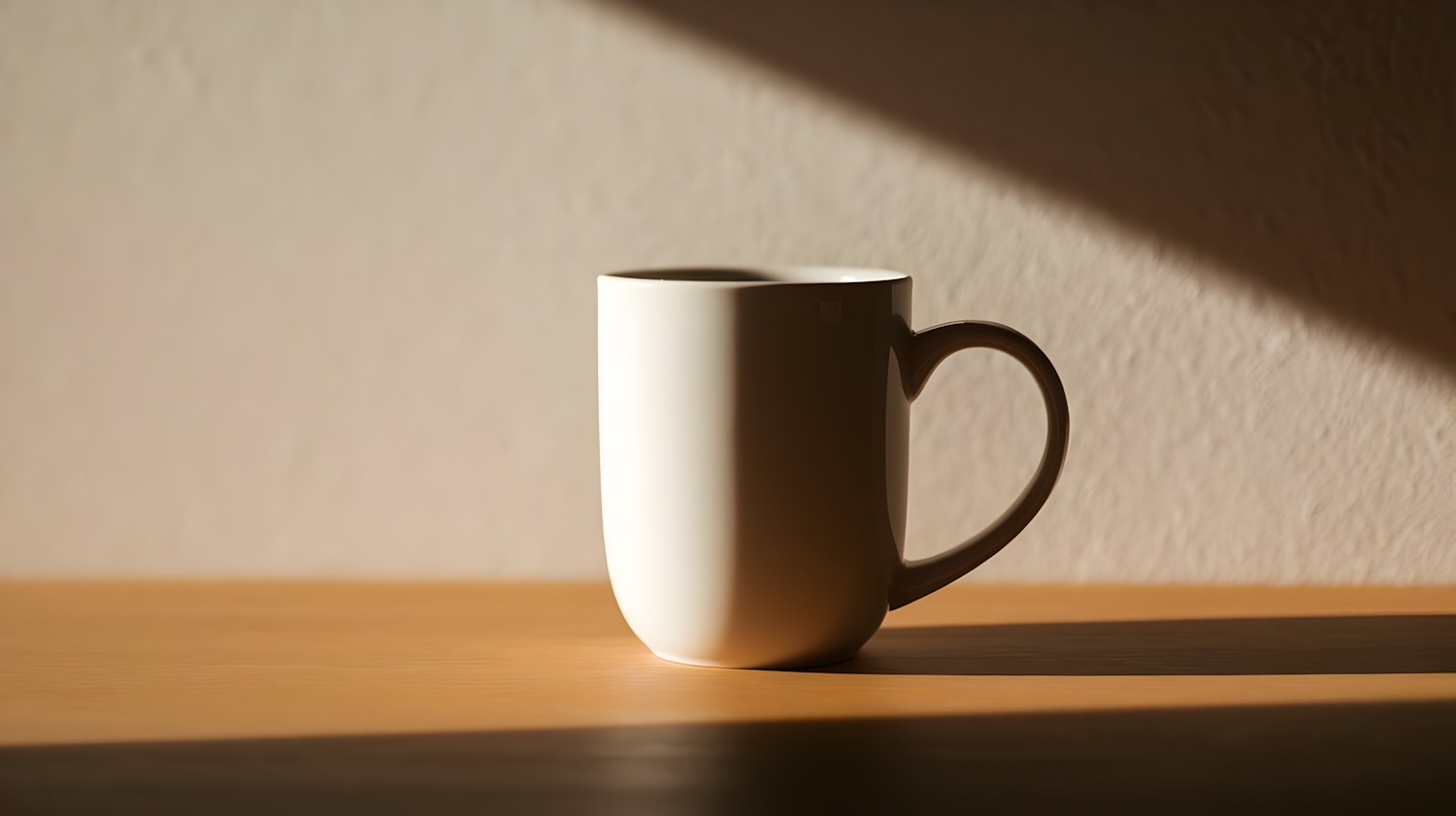 Minimalist white ceramic mug on a wooden surface, bathed in warm sunlight with soft shadows on a neutral textured wall.