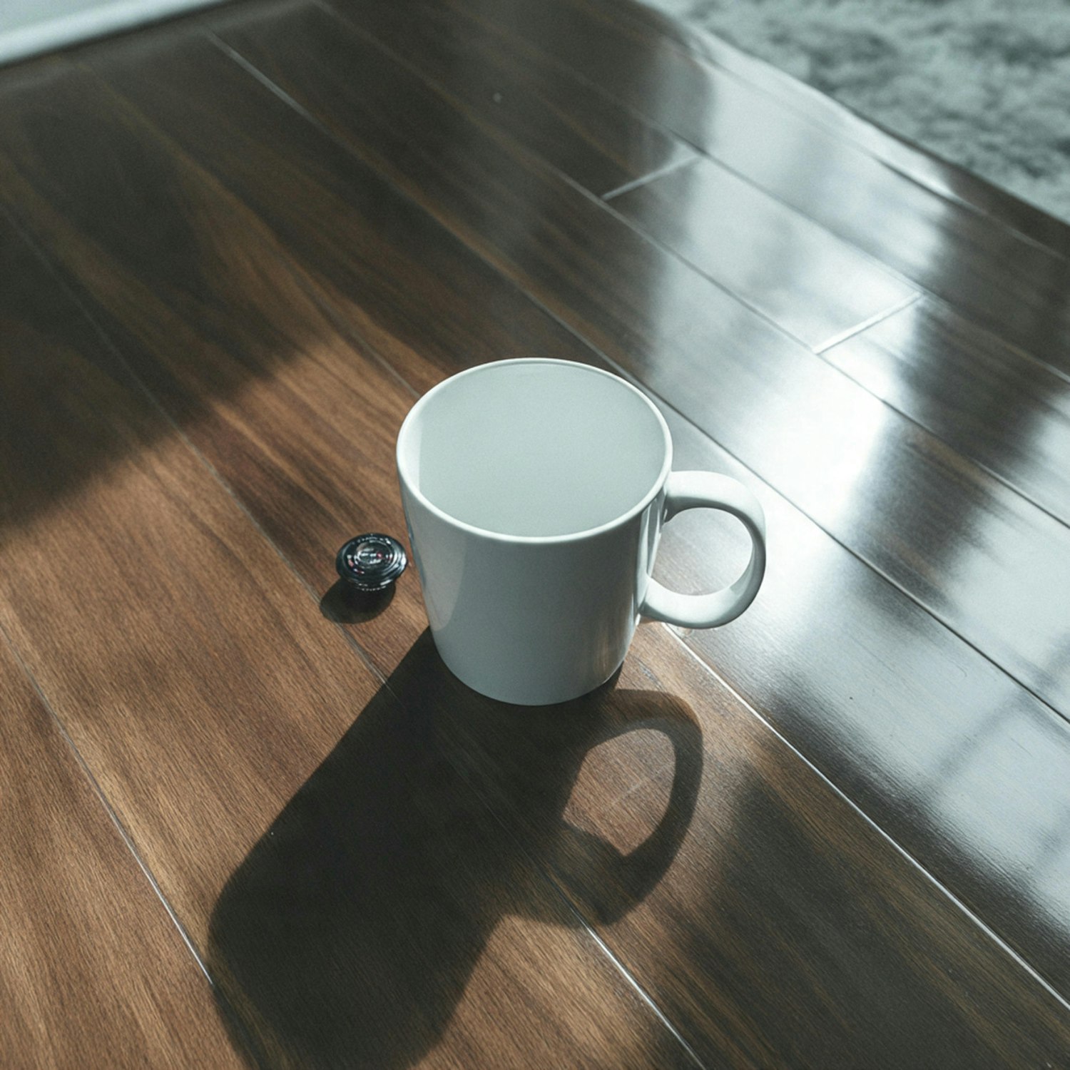 A white mug on a polished wooden surface with natural light and shadows, accompanied by a small circular object.