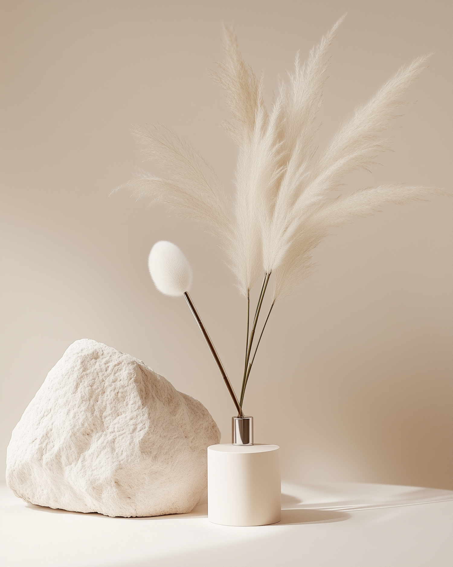 Minimalist decor with white rock, sleek vase, and pampas grass on a neutral background. Soft lighting enhances the serene aesthetic.