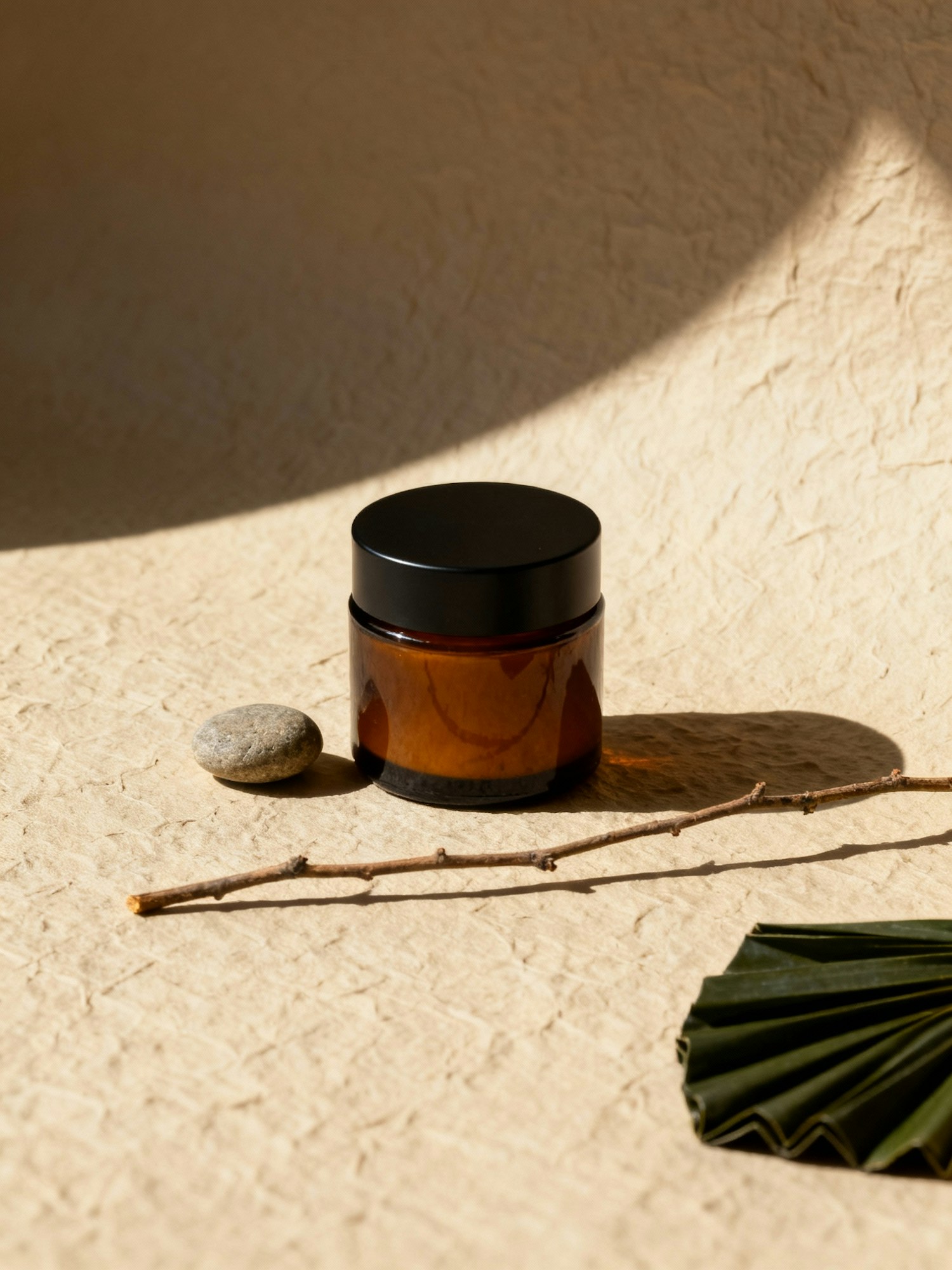 Amber skincare jar with black lid, no label or text, placed near the center of a beige textured backdrop. A small stone rests nearby, with a thin branch casting a delicate shadow across the surface. A folded dark-green leaf sits in the corner. The light is warm and diagonal, emphasizing the tactile surface and the elegance of the materials. The aesthetic feels sensory and modern, yet timeless.