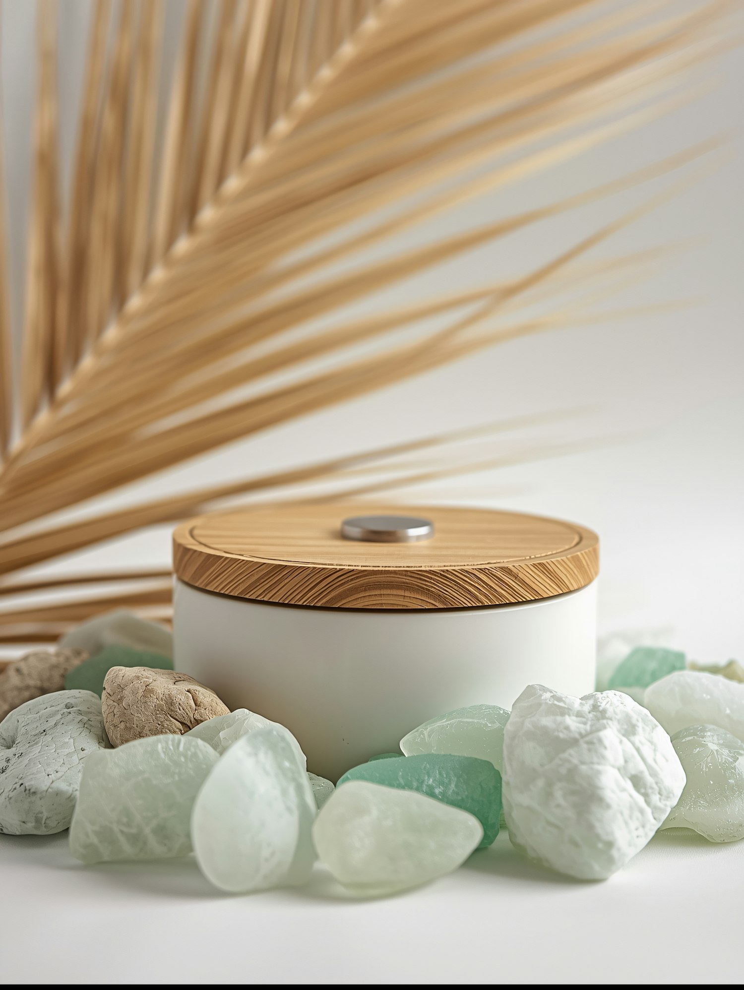 Minimalist setup with a wooden-lid container, green and white stones, and a dried palm leaf for a natural, serene vibe.