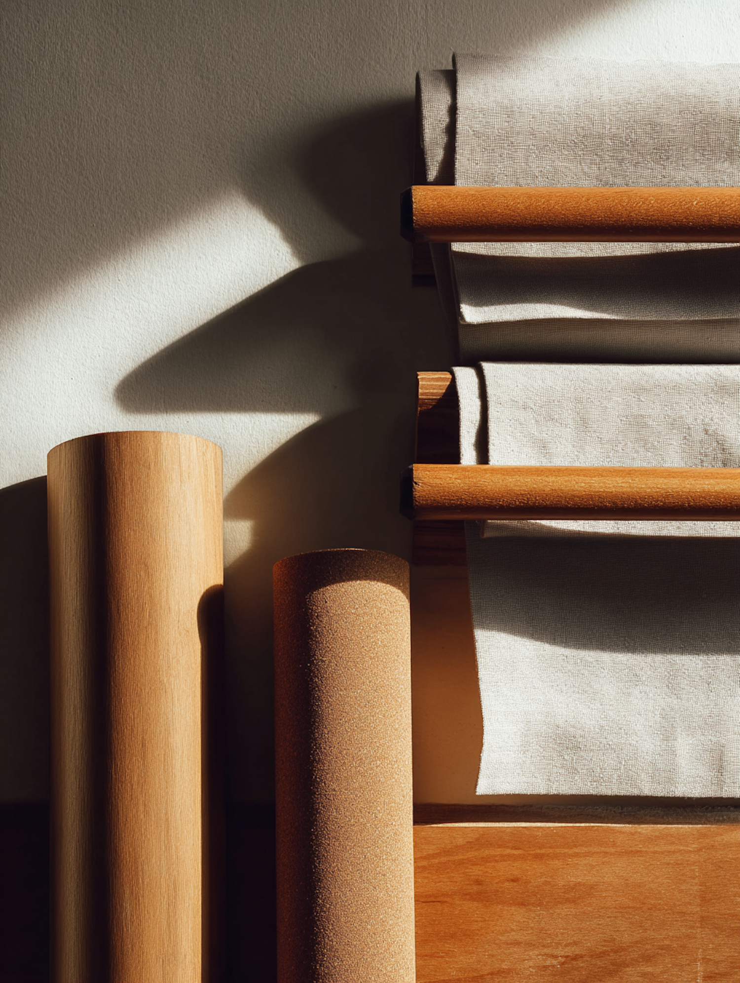 Minimalist arrangement of wooden rods, fabric, and rolls in warm light, highlighting natural textures and earthy tones.