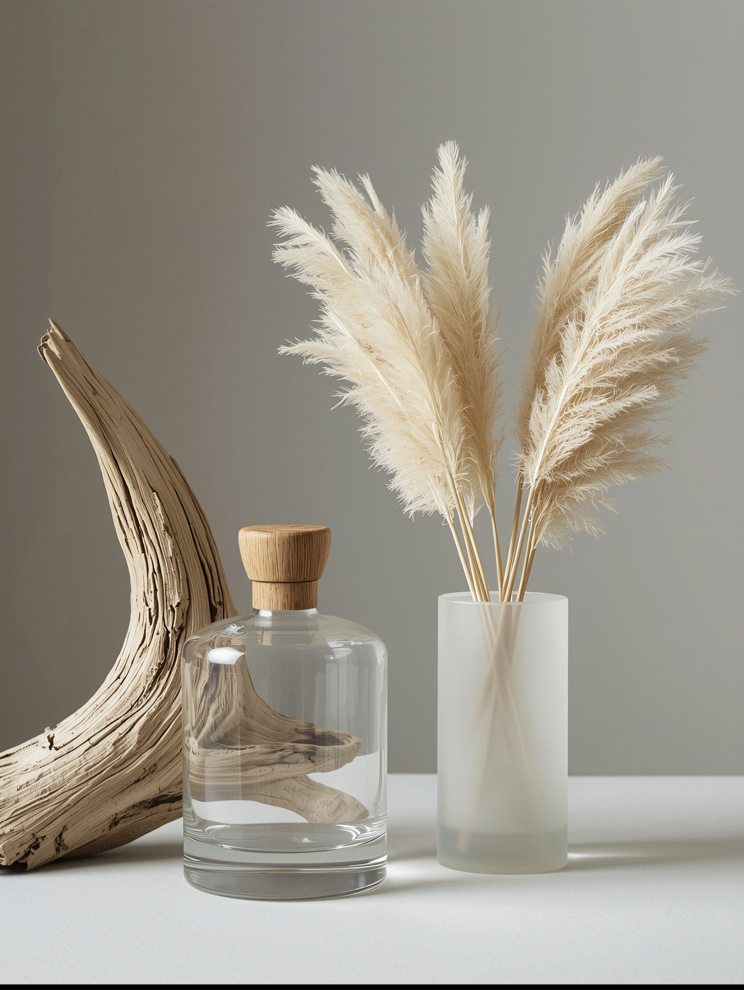 Minimalist decor with pampas grass in a frosted vase, a clear glass bottle, and driftwood on a white surface. Neutral tones and natural textures.
