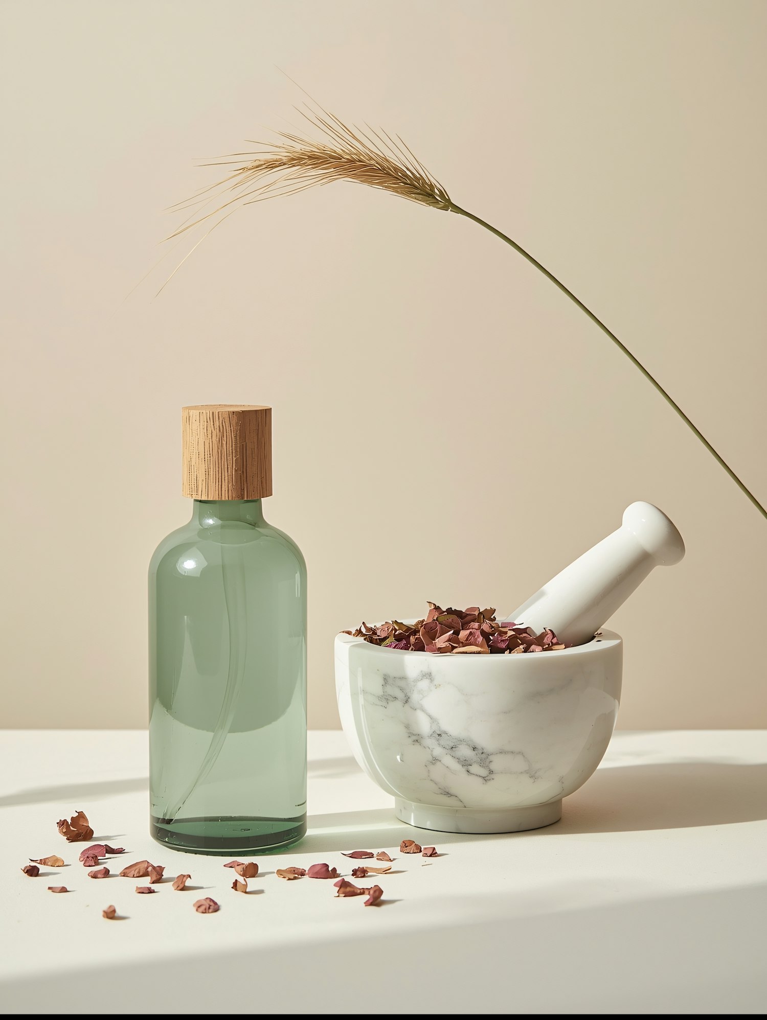 A green glass bottle, marble mortar with rose petals, and a wheat stalk create a serene, natural aesthetic in this minimalist setup.