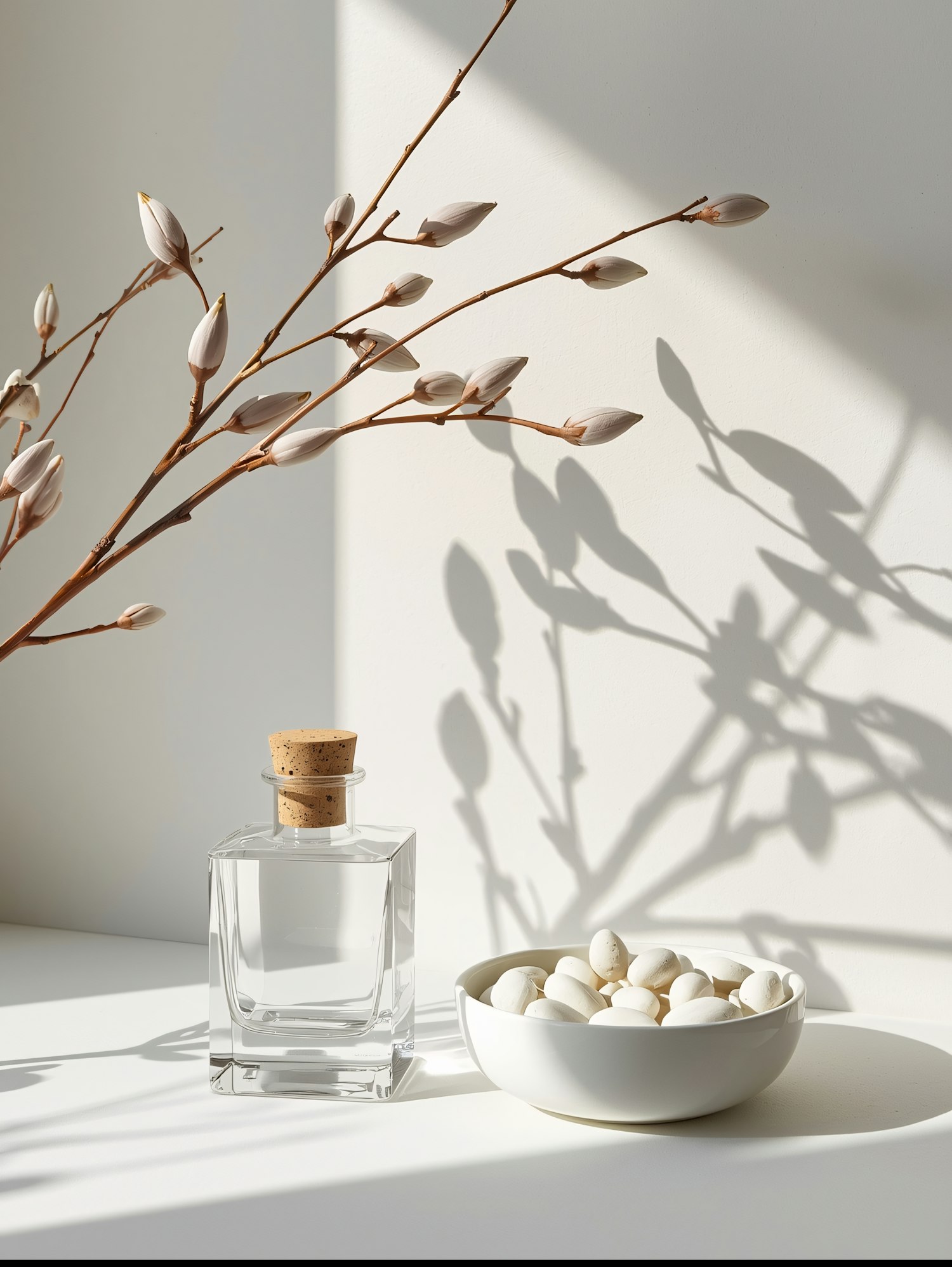 Minimalist decor with a glass bottle, white bowl of pebbles, and a branch casting shadows in soft natural light.