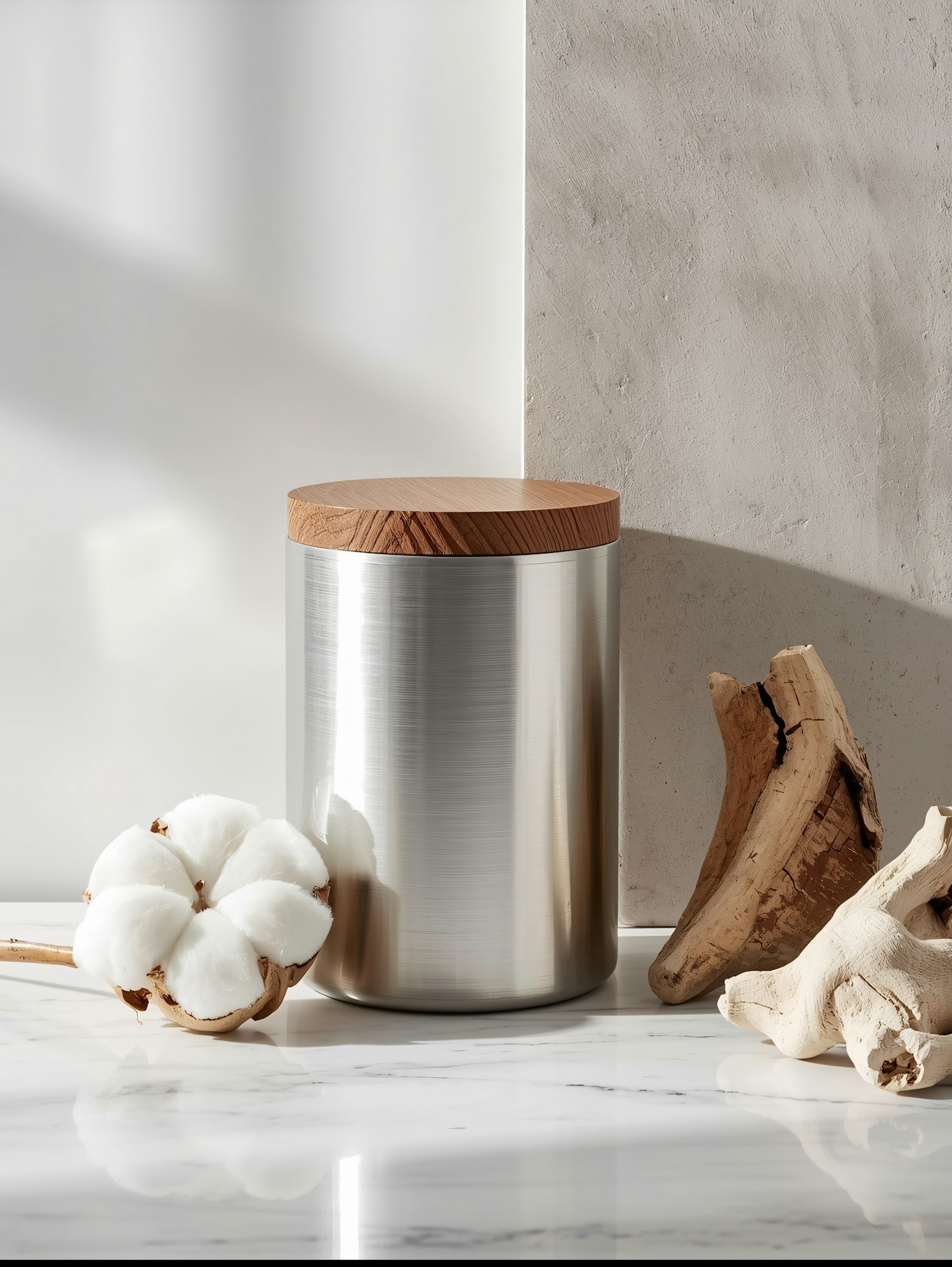 Sleek metallic container with a wooden lid, paired with cotton and driftwood on a marble surface, blending modern and natural aesthetics.