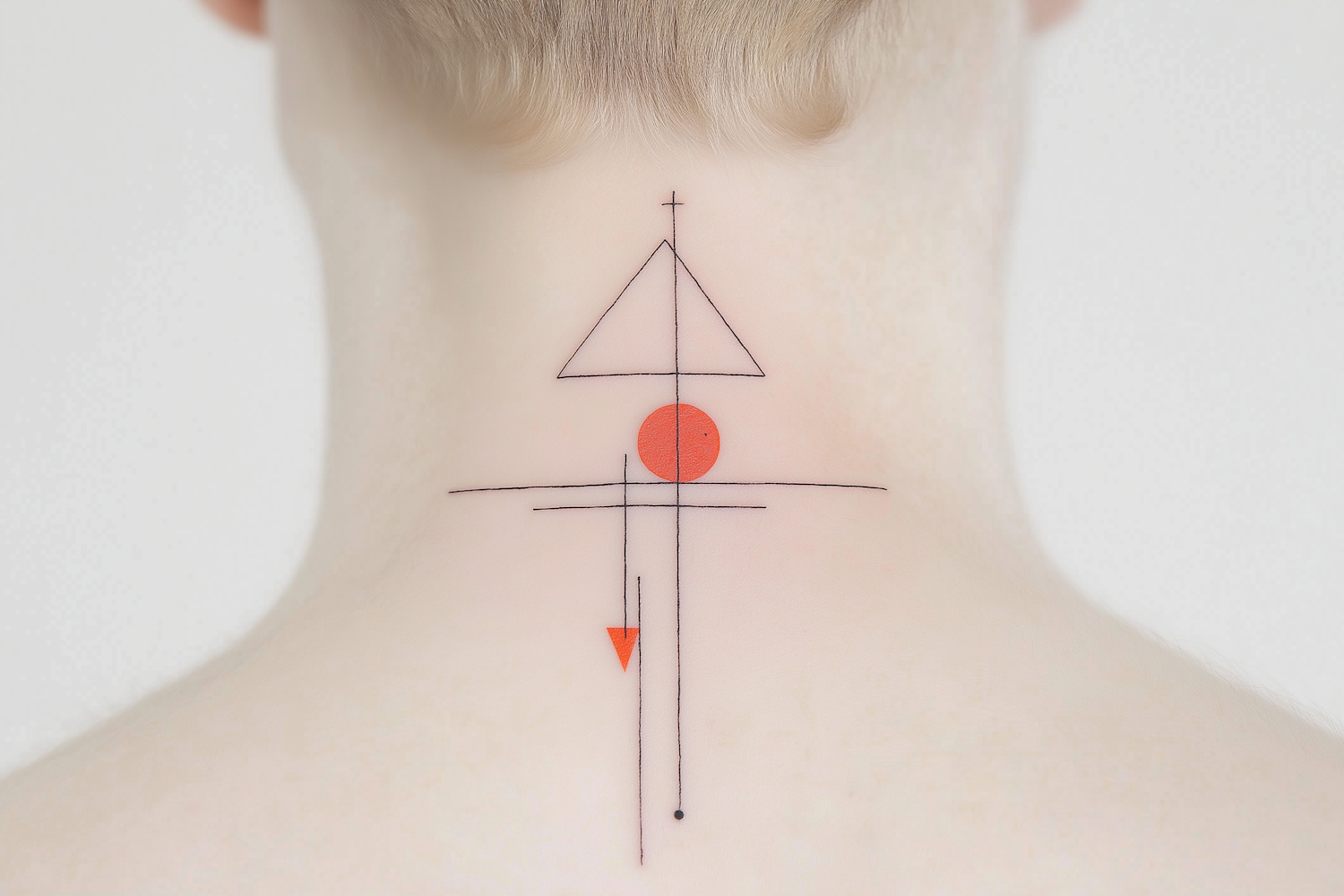 Minimalist geometric tattoo on the back of a neck, featuring a triangle, circle, and lines in black and red ink on pale skin.