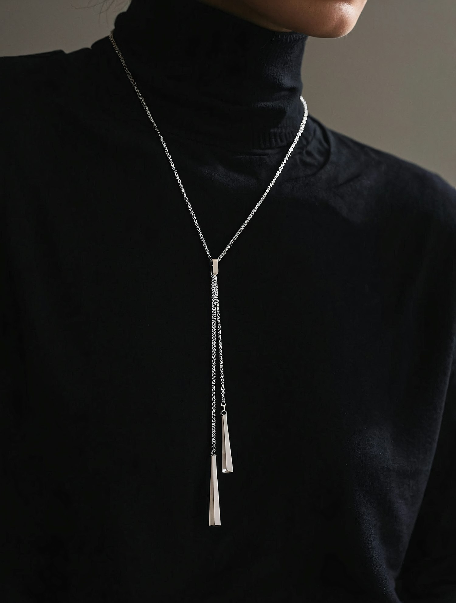 Minimalist silver necklace with tapered pendants over a black turtleneck, showcasing sleek and modern jewelry design.