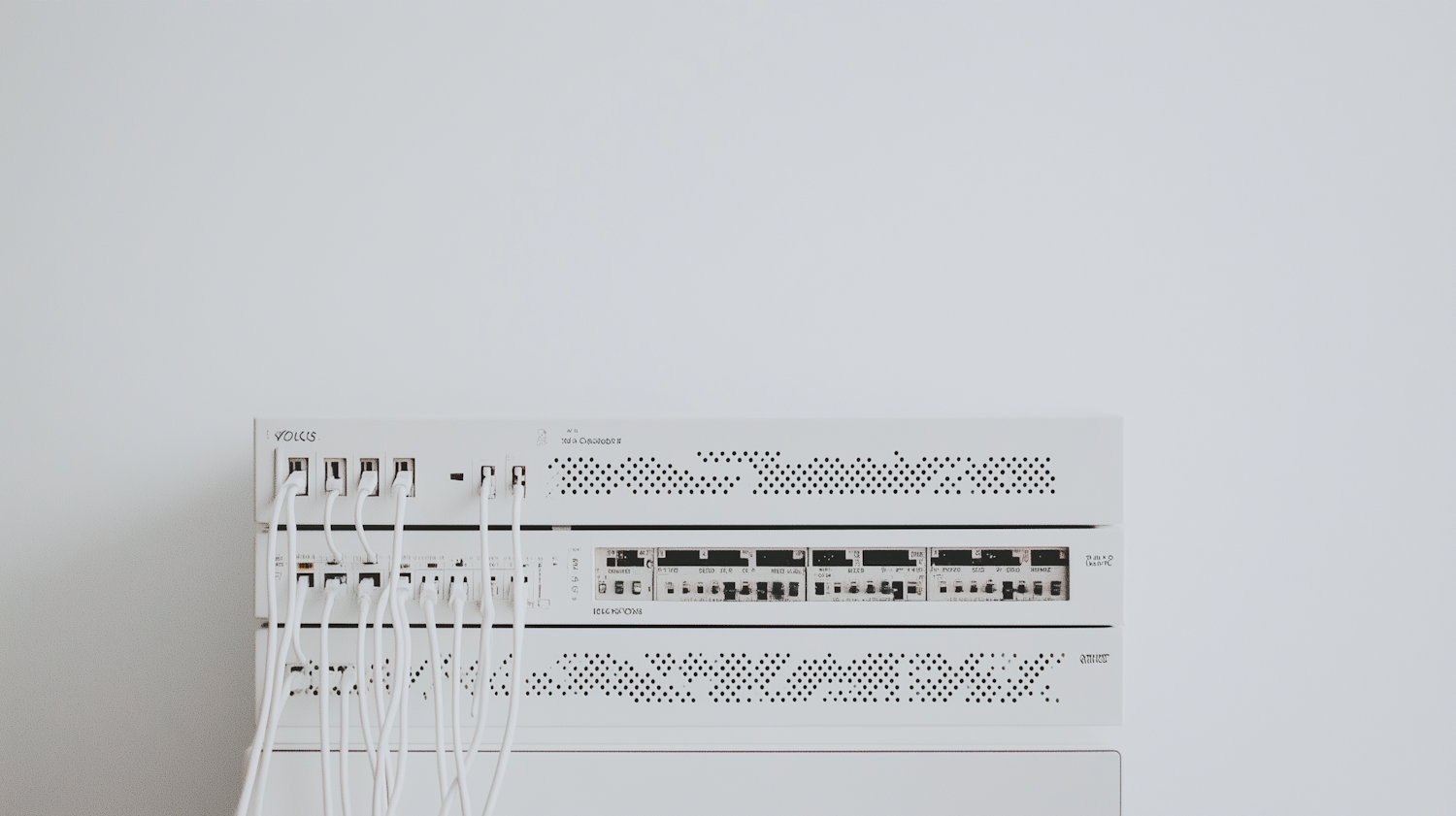 Minimalist white network server with Ethernet cables plugged in, set against a plain white background. Clean and modern tech setup.