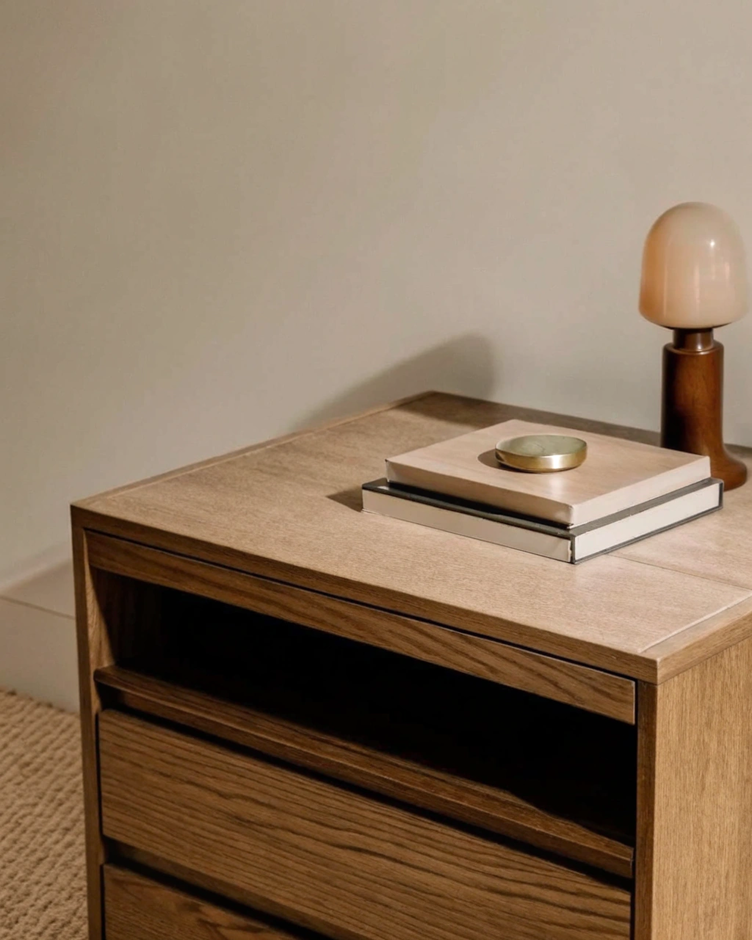 Minimalist wooden nightstand with books, a brass dish, and a frosted glass lamp. Perfect for modern, cozy interiors.