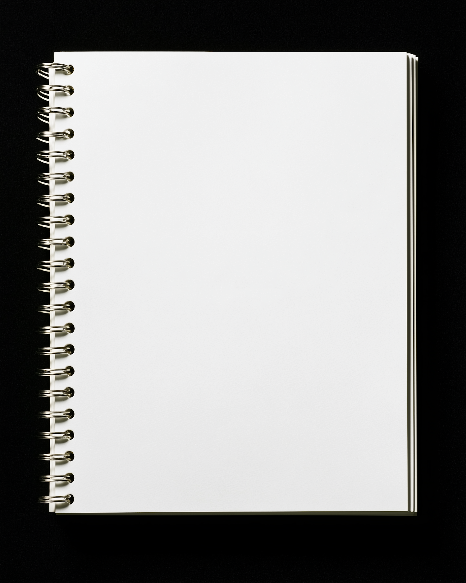 A blank spiral-bound notebook with a white cover on a black background, perfect for sketching or note-taking.