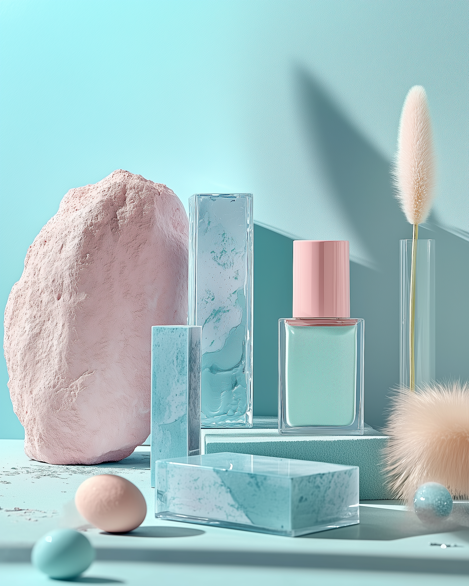 Pastel-themed arrangement with pink rock, glass blocks, and pampas grass. Elegant turquoise and pink hues create a serene aesthetic.