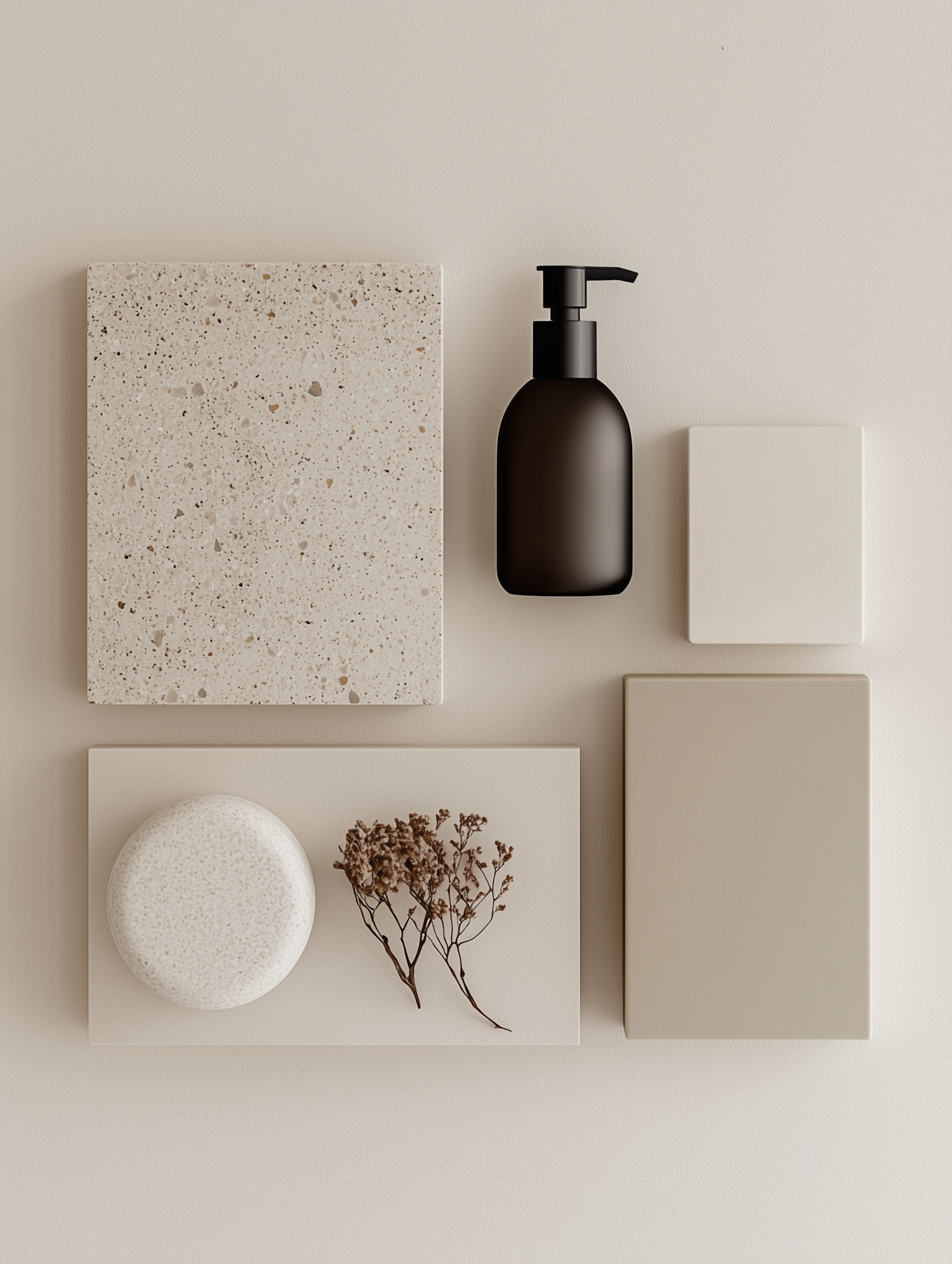 Minimalist arrangement with a black pump bottle, terrazzo tile, and dried flowers on neutral background.