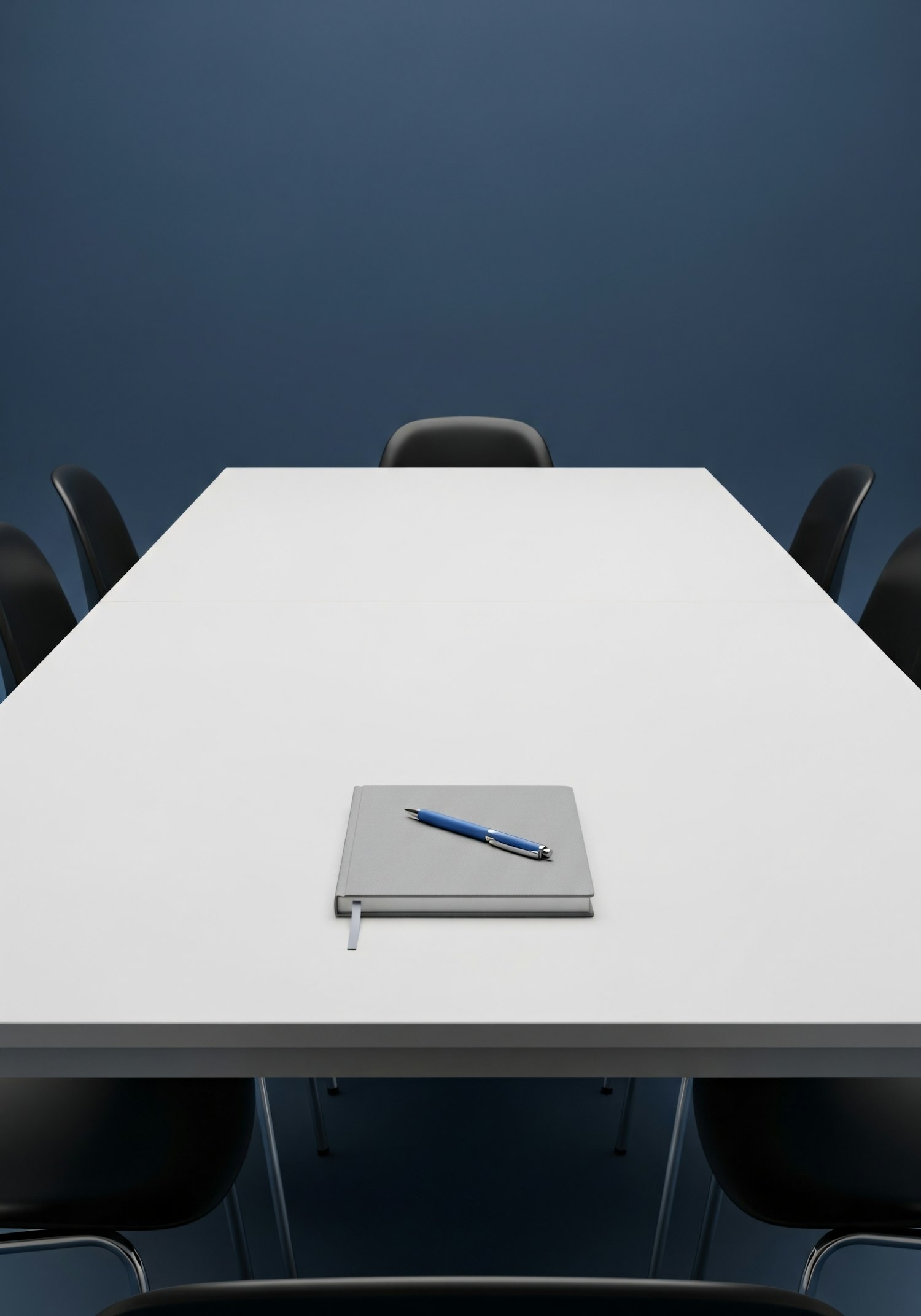 A clean, minimalist office table setup with a gray notebook and blue pen, surrounded by black chairs against a blue background.