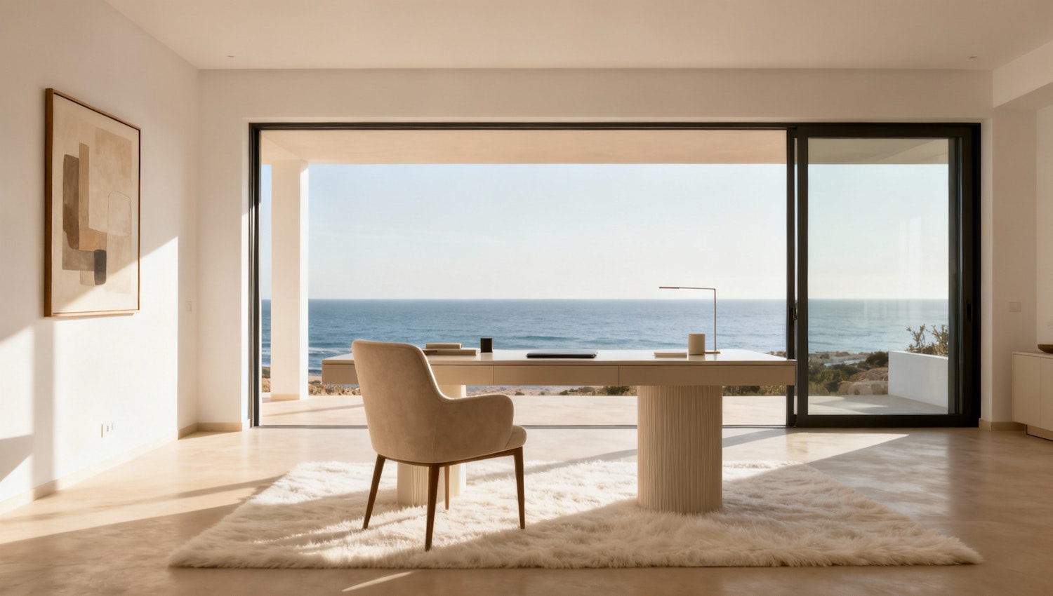Photographed in warm natural daylight with the Fujifilm X-T5 camera, cinematic composition, soft neutral tones, luxury aesthetic, minimal design, high-end editorial style, muted background, no people—the spacious and open-plan home office of a luxurious home in Southern Spain, offering a haven of comfort and luxury. The smooth walls look freshly painted in a soft white colour. The interior of the living area is a blend of contemporary design and timeless elegance. The space boasts panoramic views of the Mediterranean Sea. The colour palette of the decor and furniture is soft-neutral tones with subtle accents of sandy beige Framed abstract art created additional elegance. There is a comfortable yet elegant desk and seating area, and the room is inviting, modern and serene. There is an elegant and timeless thin white wool rug on the floor, which adds subtle comfort.