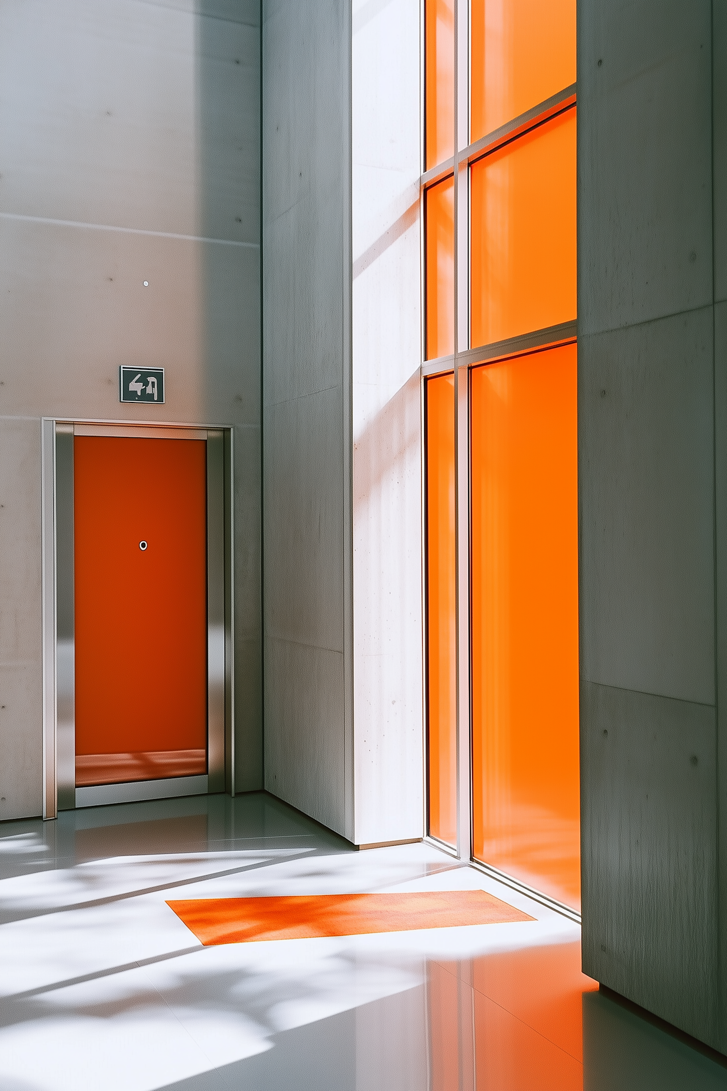 Minimalist interior with orange door, tinted glass panels, and sunlight reflections on a glossy white floor. Modern and vibrant design.
