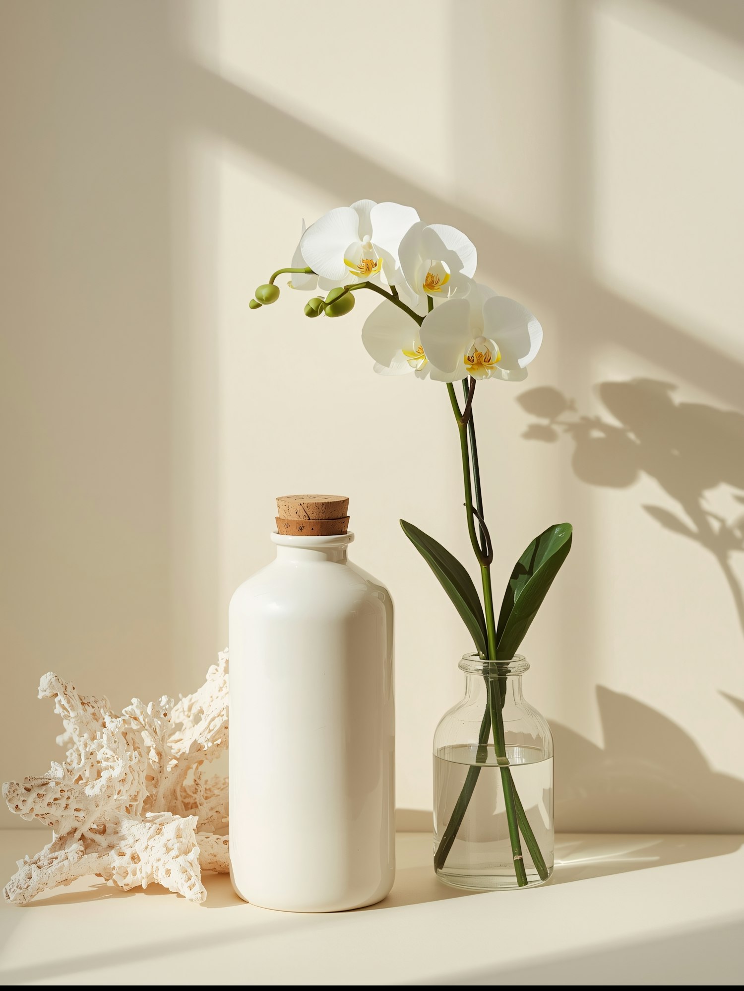 Minimalist decor with a white ceramic bottle, glass vase with orchids, and coral on a beige background with soft natural light.