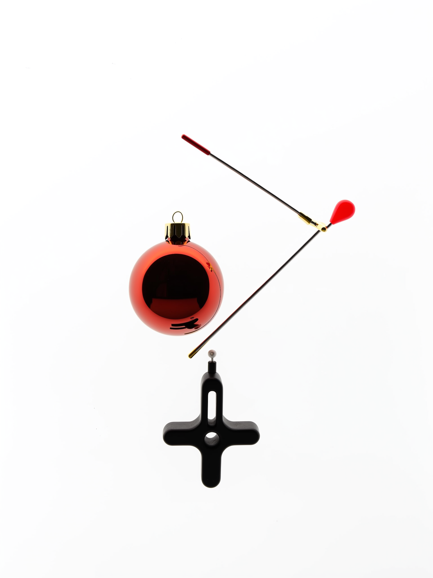 Minimalist arrangement of a red ornament, black cross-shaped object, and red-tipped rods on a white background.