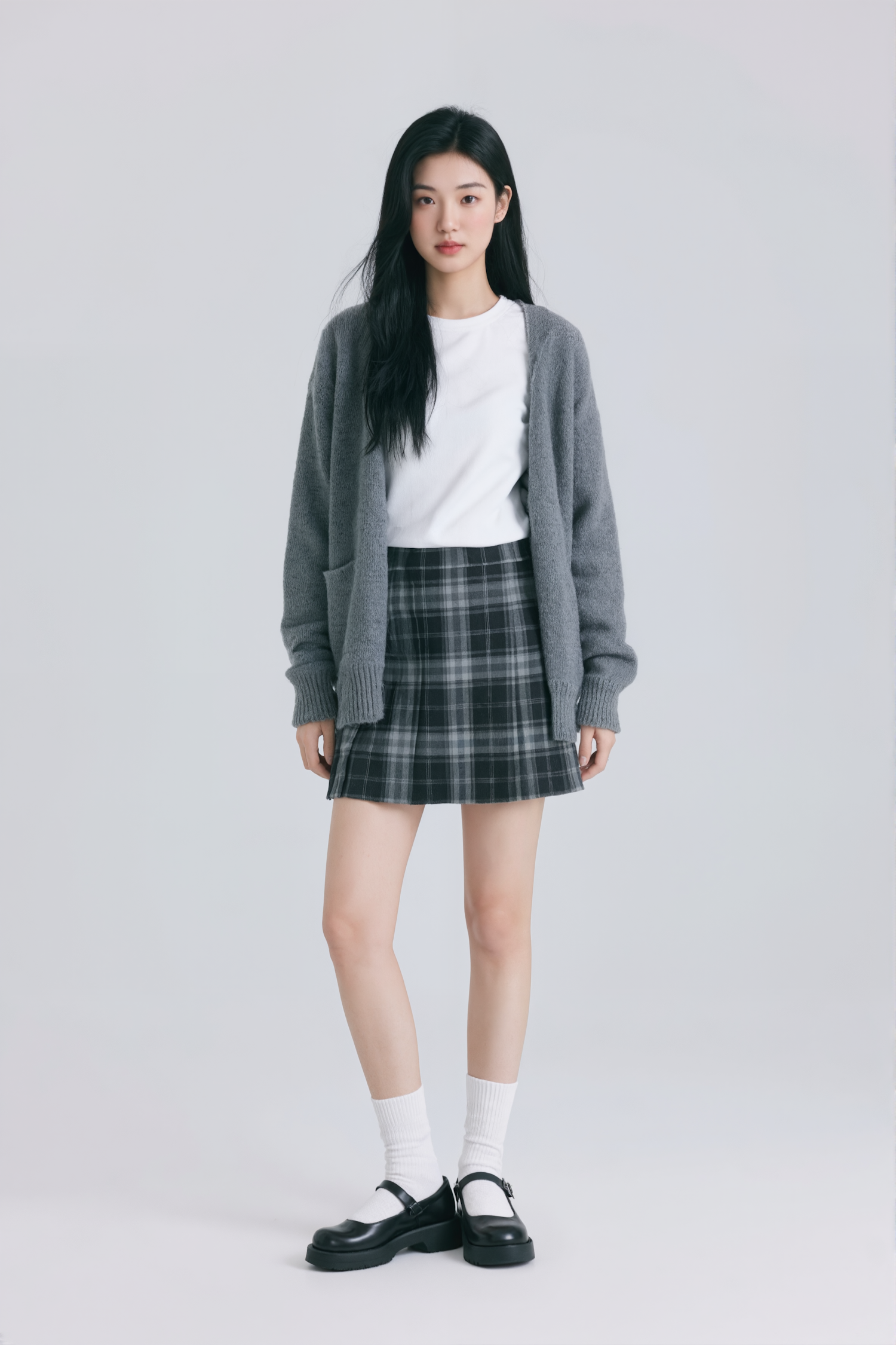 Young woman in a gray cardigan, plaid skirt, and Mary Jane shoes, standing against a light gray background with a minimalistic vibe.