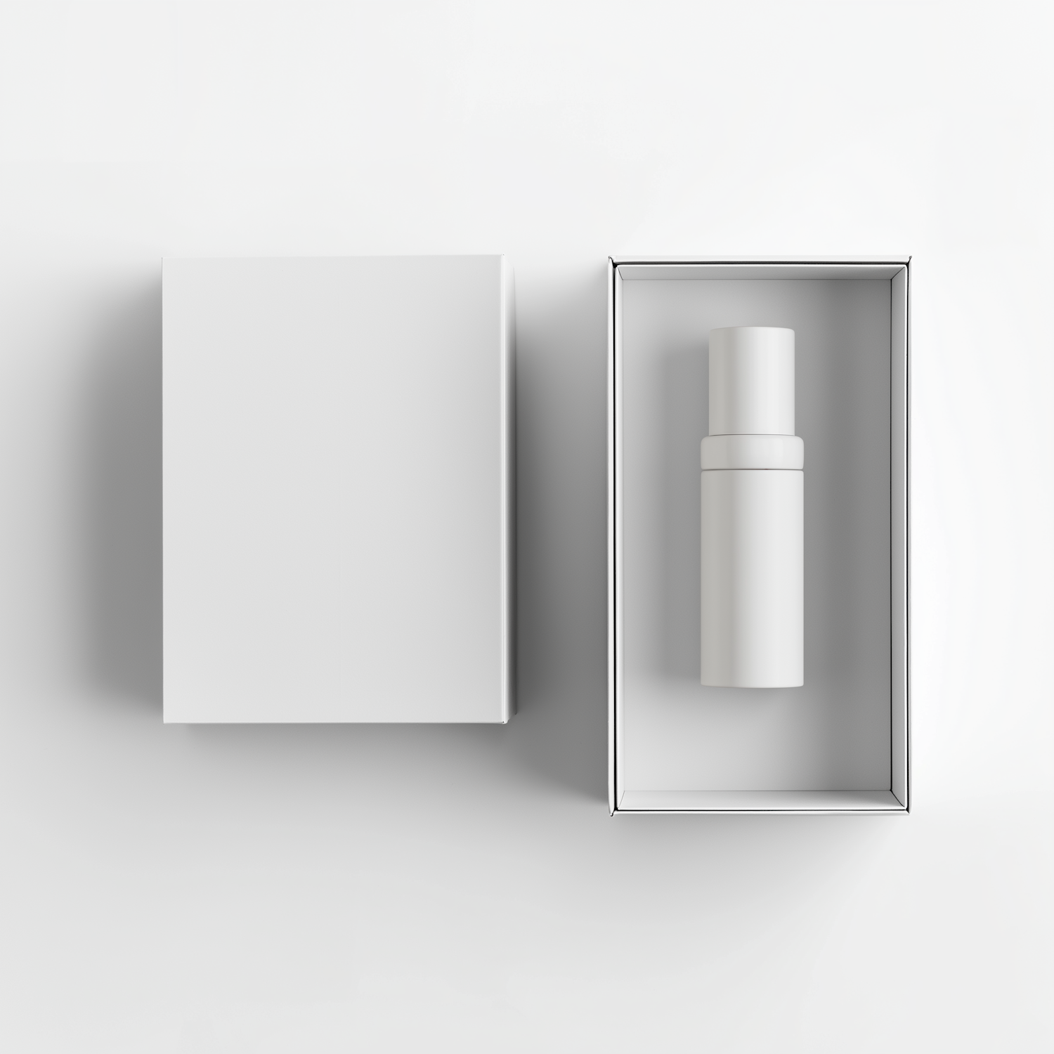 Minimalist white packaging with a cylindrical bottle inside a rectangular box. Clean, modern design with no visible branding or text.