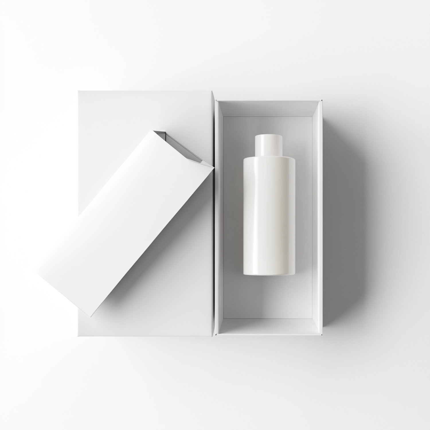 Minimalist white packaging with a sleek cylindrical bottle inside a rectangular box, perfect for cosmetics or skincare products.