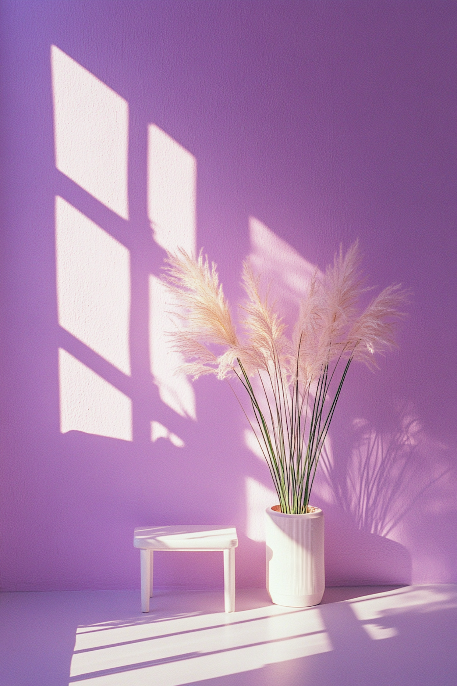 Minimalist decor with pampas grass in a white vase, a small stool, and soft sunlight casting shadows on a pastel purple wall.