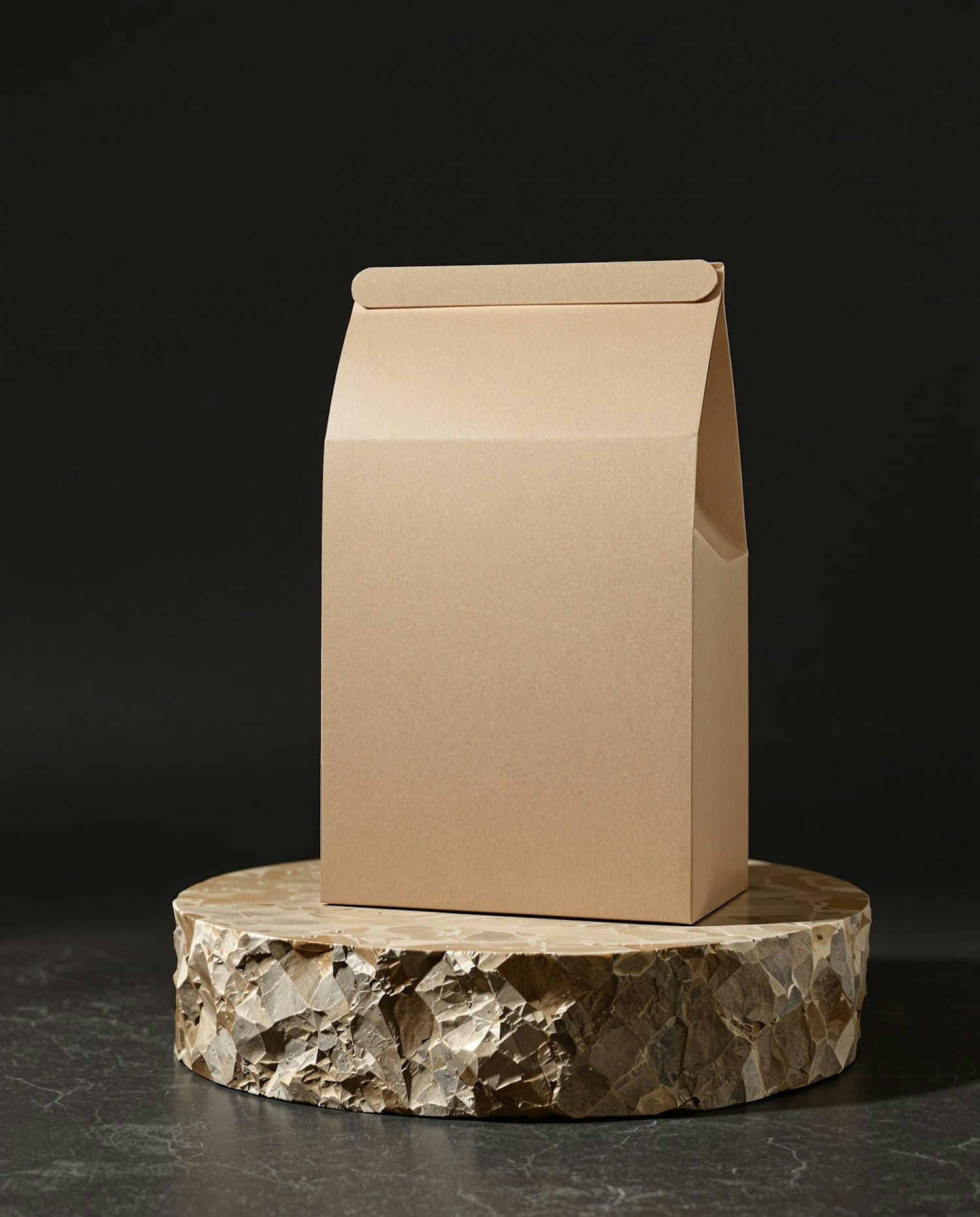 Minimalist image of a paper bag placed on a textured circular stone platform against a dark background.