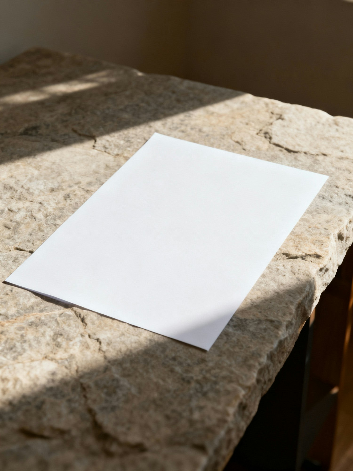 A white sheet of paper on a textured stone surface, illuminated by natural sunlight, creating a minimalistic and serene composition.