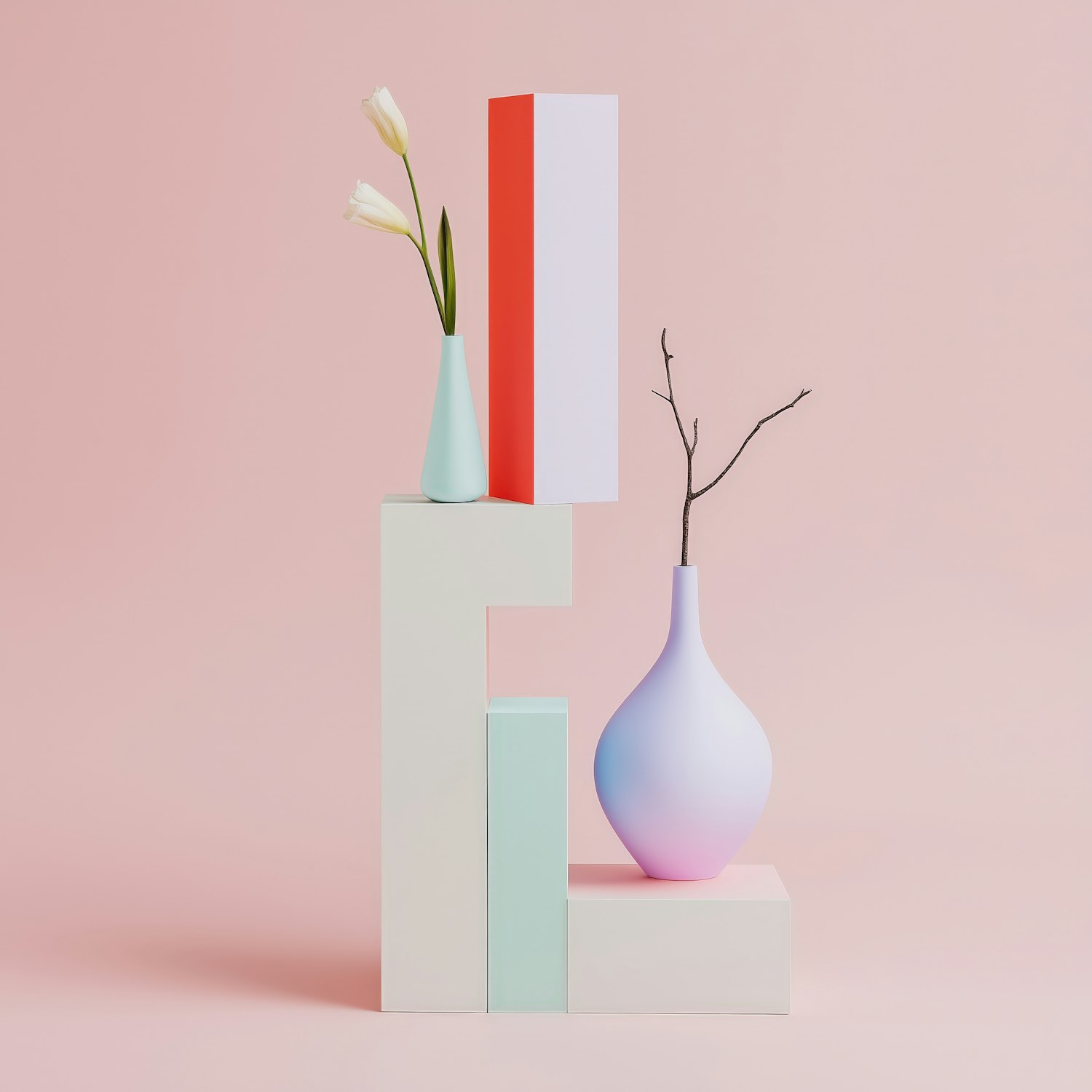 Minimalist pastel decor with geometric shapes, a mint vase with tulips, and a gradient vase with a twig on a pink background.