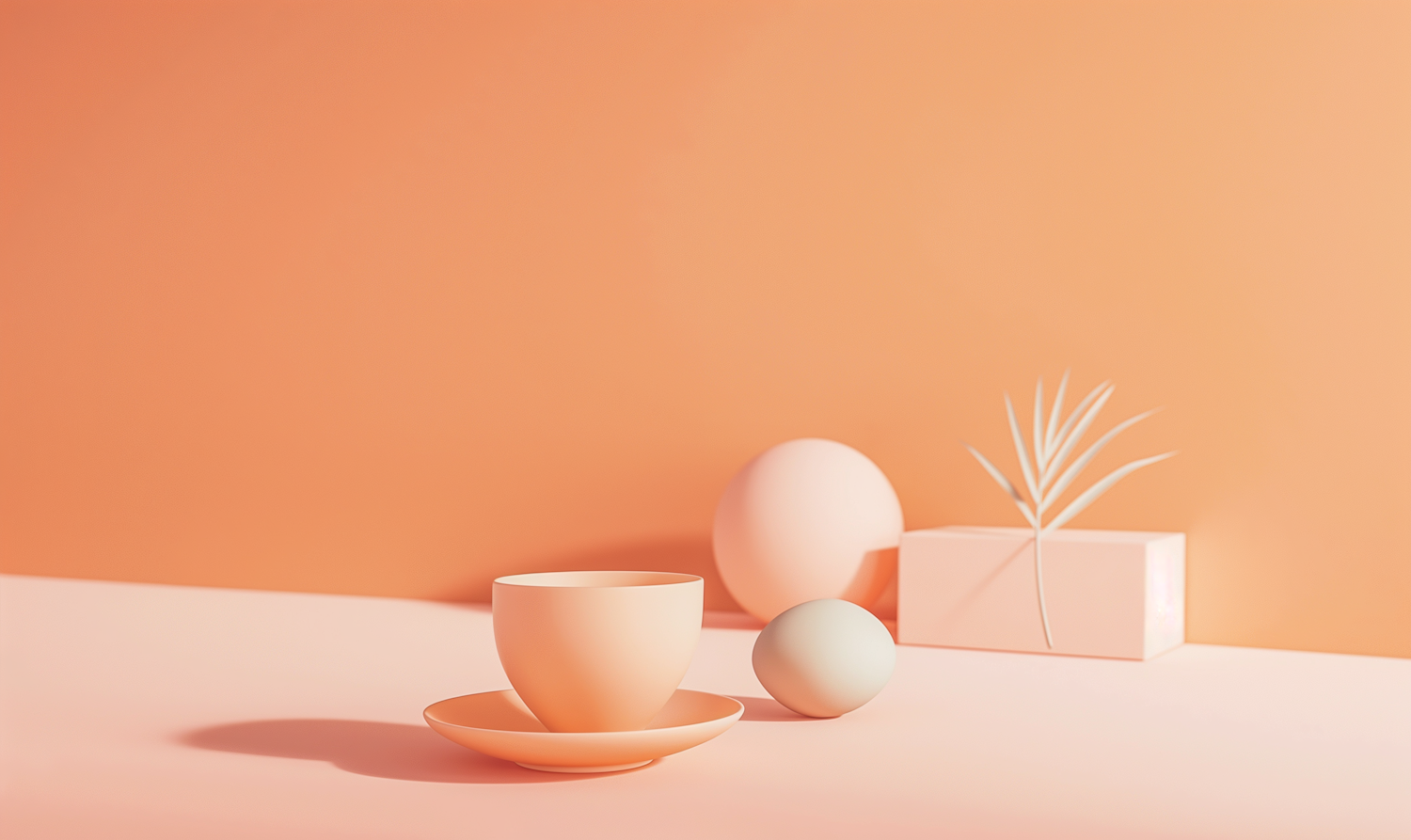 Minimalist pastel scene with a peach cup, saucer, and geometric shapes on a soft pink surface.
